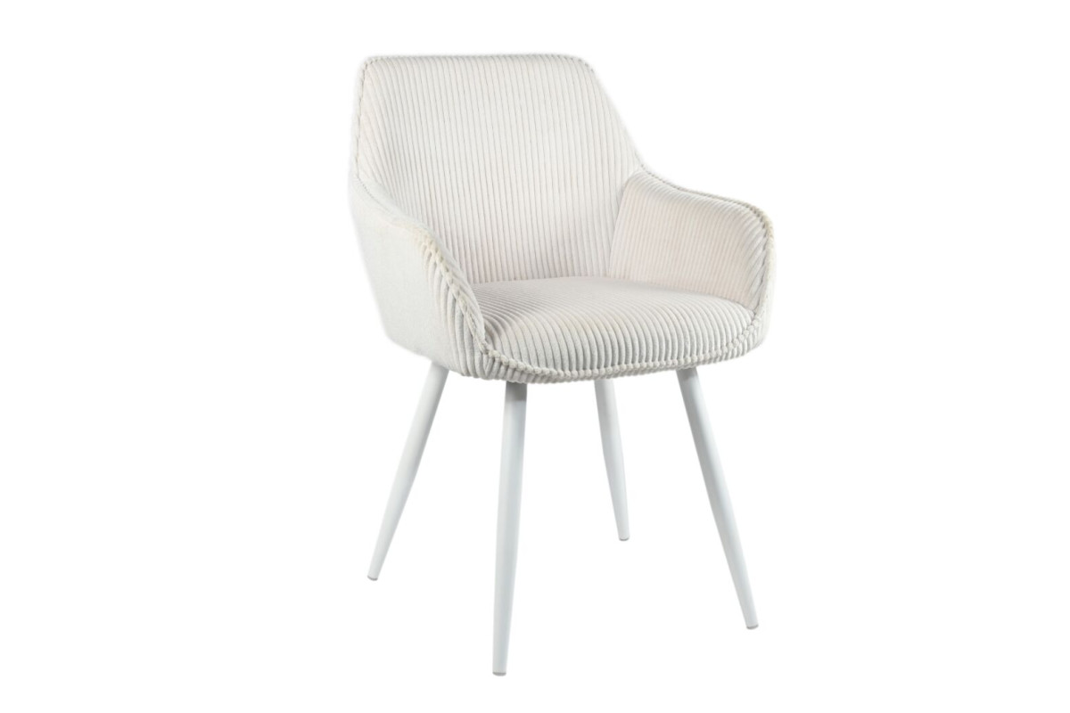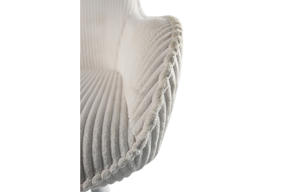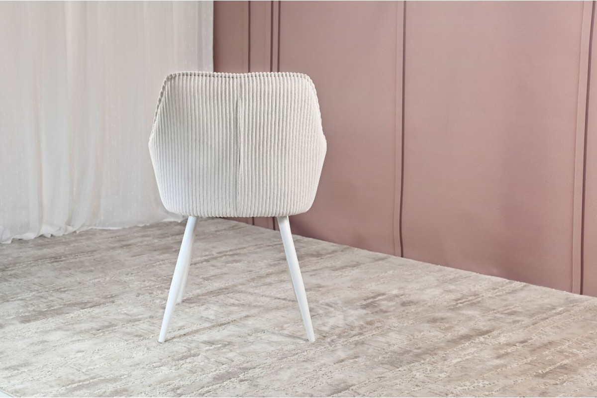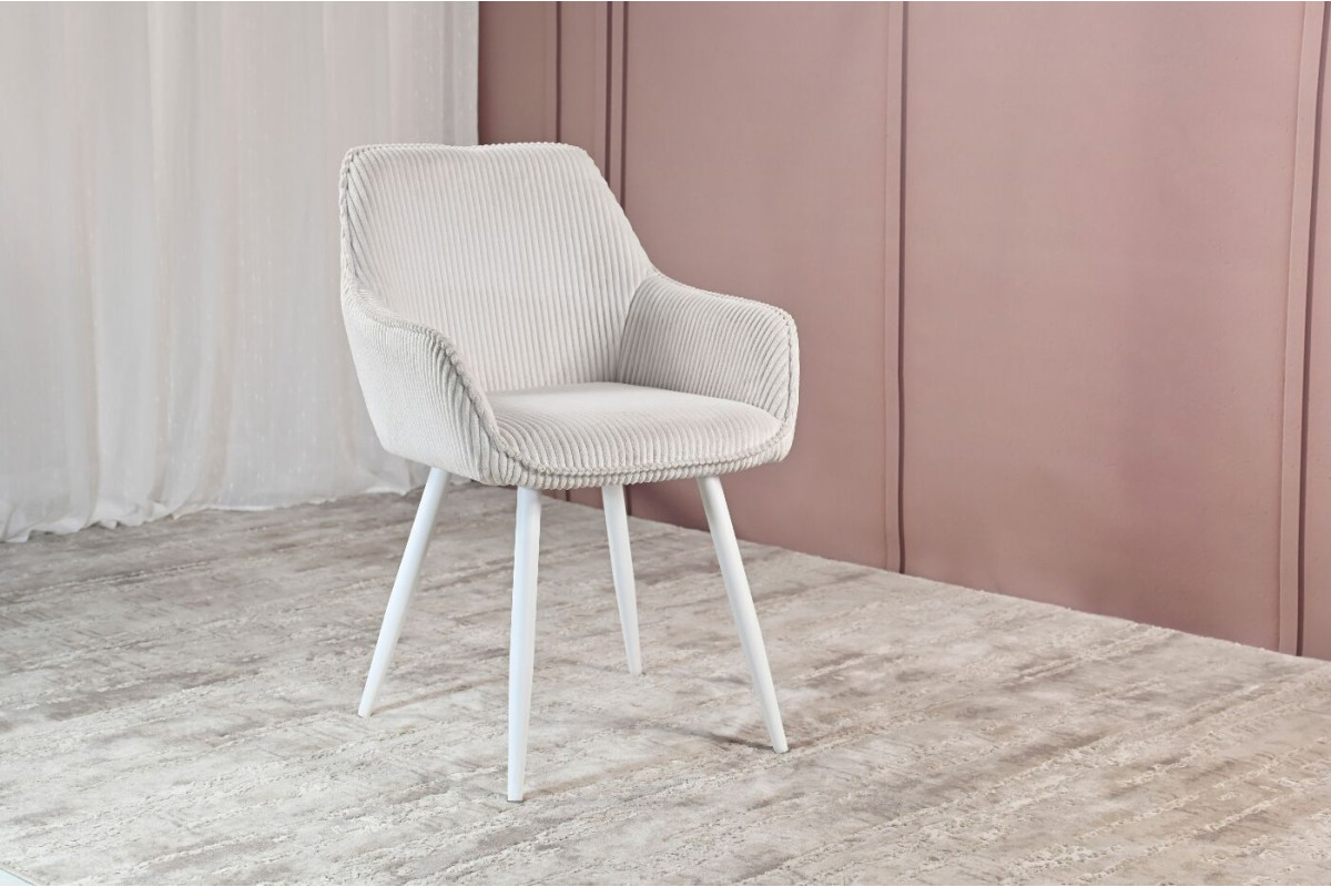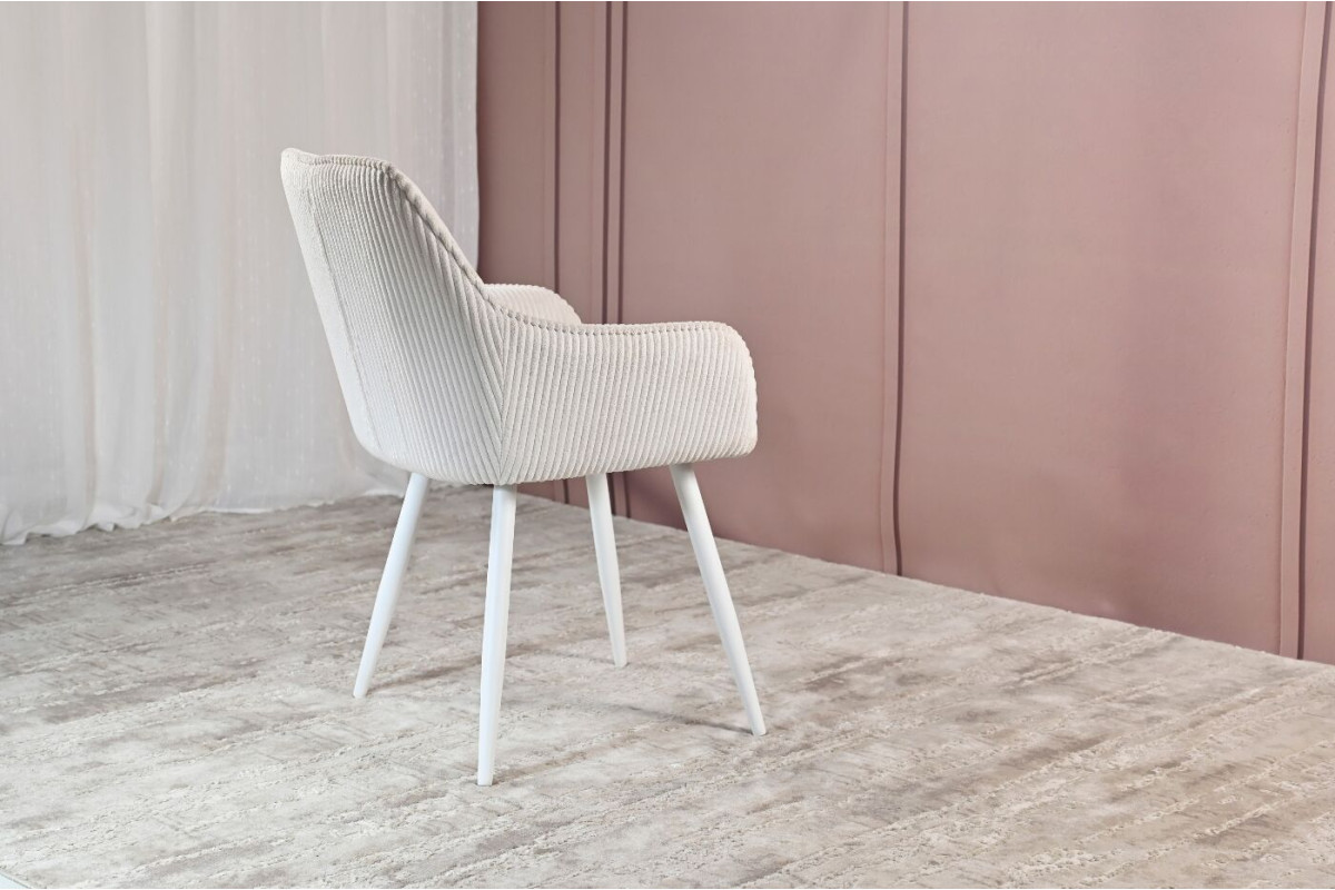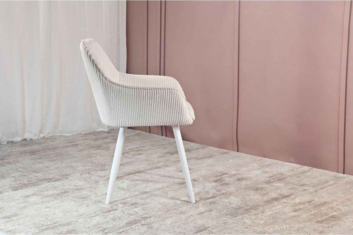 Стілець M-240 білий антік + білий — елегантний акцент для сучасного інтер’єру. Ця модель поєднує м’яку візуальність і практичний комфорт. Оббивка з вельвету рубчик у відтінку \"білий антік\" має виразну текстуру, що додає глибини образу й приємна на дотик. Відтінок м’який, спокійний, із легкою ноткою ретро — виглядає вишукано та водночас невимушено. Широке сидіння з підлокітниками створює відчуття простору та підтримки, дозволяючи розслабитись навіть під час тривалого перебування. Основа з фарбованого металу у білому кольорі додає легкості зовнішньому вигляду, не втрачаючи при цьому стійкості конструкції. M-240 — чудовий вибір для інтер'єрів, де цінується світло, повітряність і тактильний комфорт.