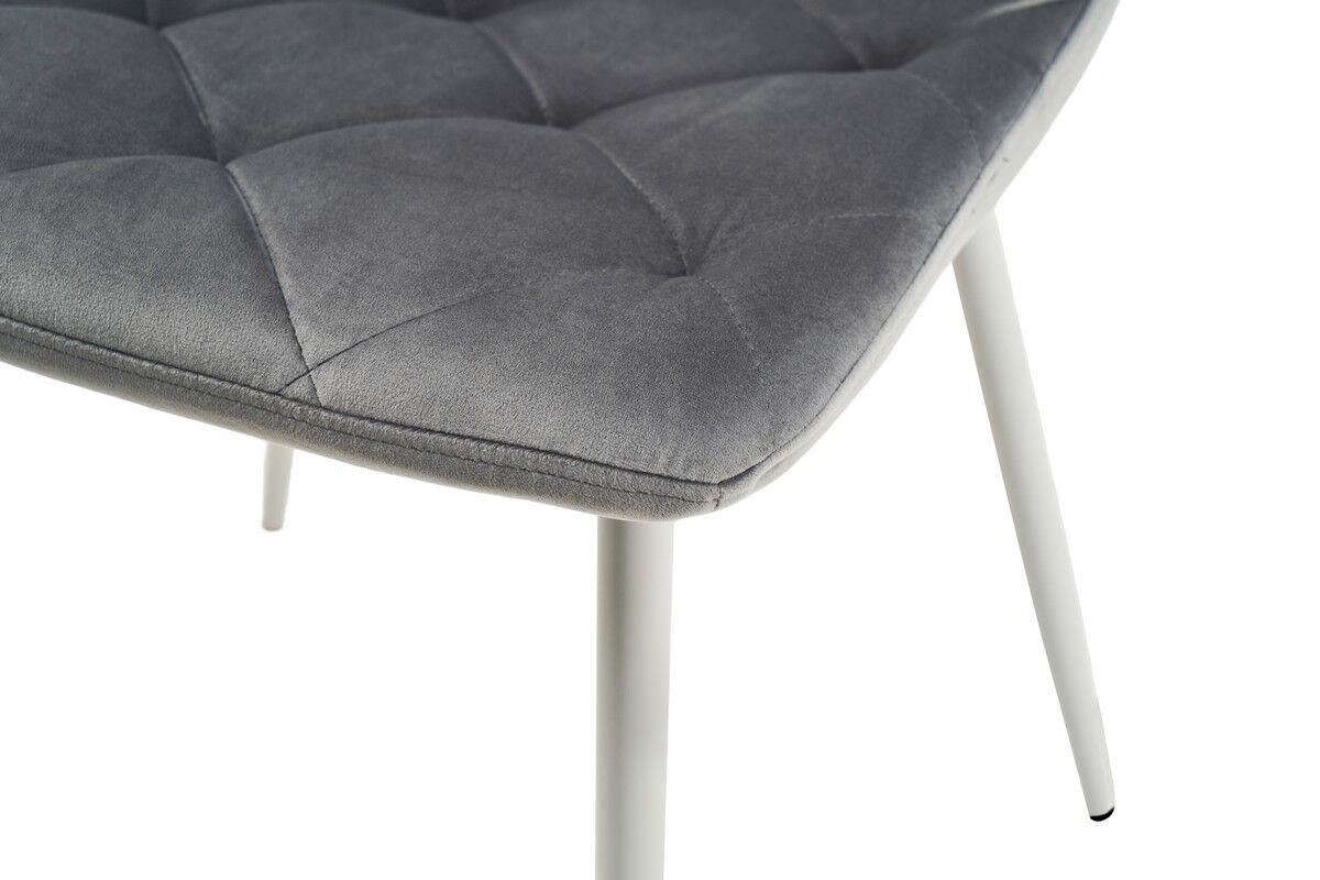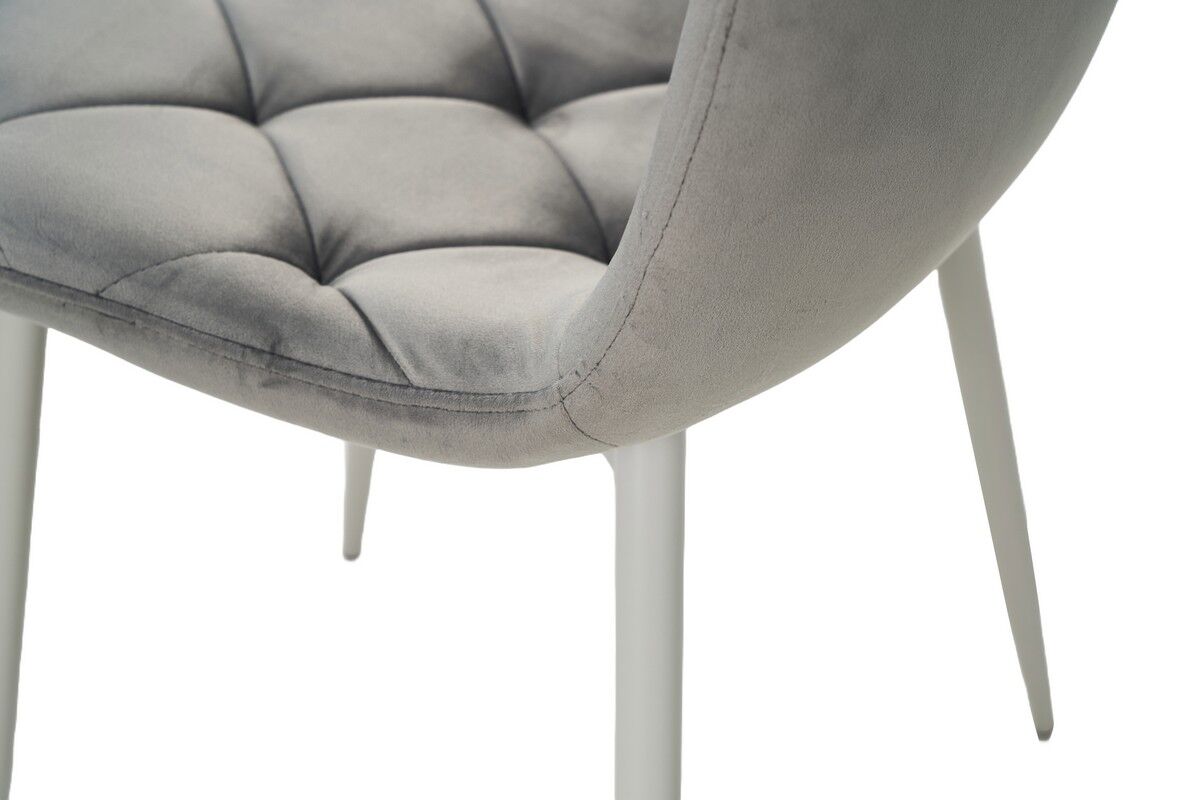 Стілець поєднує світло-сірий велюр з білим фарбованим металевим каркасом, створюючи гармонійний і витончений вигляд. Світло-сірий колір оббивки додає інтер'єру м'якості і спокою, а білий металевий каркас підкреслює чистоту ліній і додає легкості. Така комбінація ідеально підходить для сучасних інтер'єрів, доповнюючи як мінімалістичні, так і більш класичні стилі. Велюрова оббивка приємна на дотик, м'яка і стійка до зносу. Велюр не тільки додає стільцю розкішного вигляду, але й робить його комфортним для тривалого сидіння. Він також має високу стійкість до пилу і забруднень, що дозволяє легко підтримувати чистоту. Завдяки сучасному дизайну та нейтральним кольорам, цей стілець ідеально підходить для будь-якого інтер'єру. Він буде виглядати гарно в кухні, їдальні, вітальні, або навіть у офісі. Легкість та стиль дозволяють використовувати його в різних умовах, не втратити своєї елегантності та функціональності.