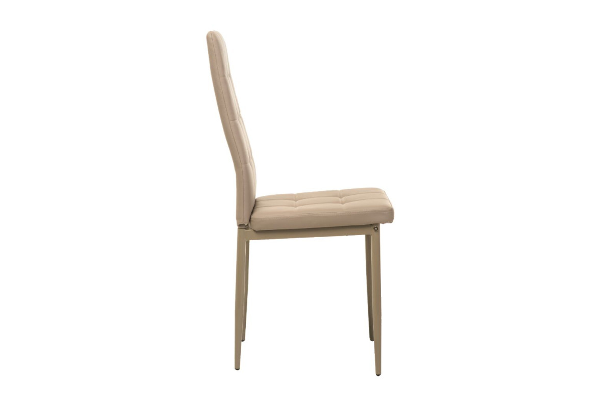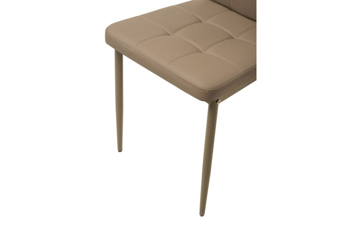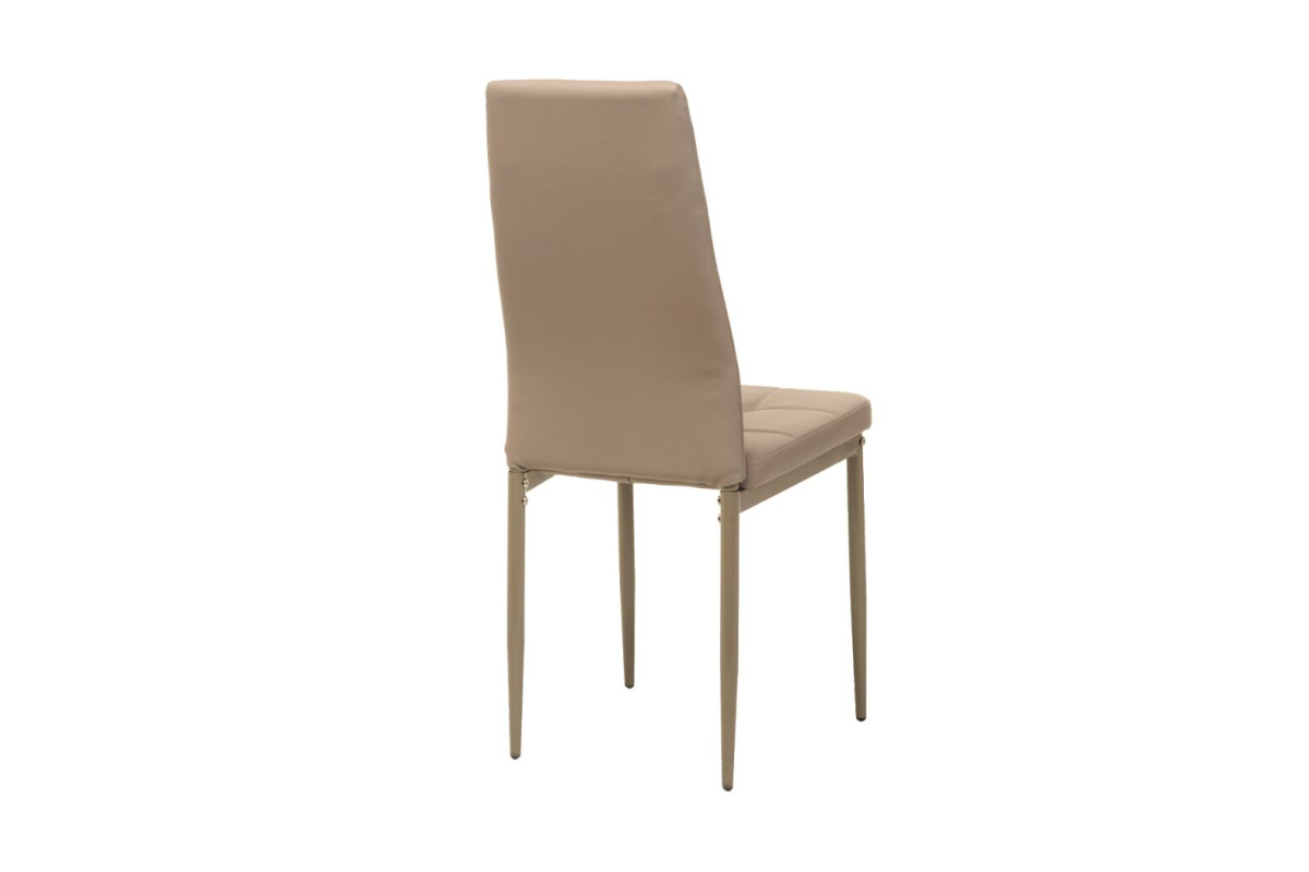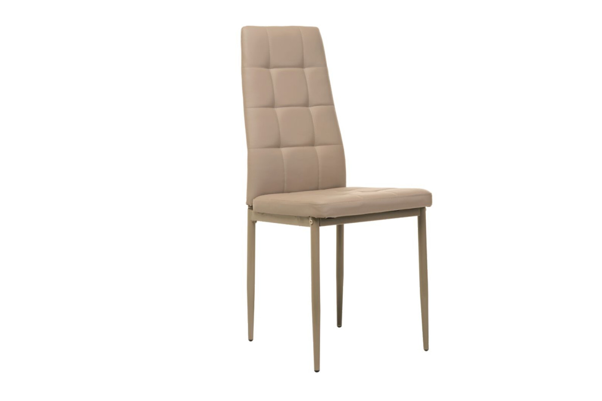 Оббивка з екошкіри благородного кольору капучино надає відчуття м'якості й затишку, додаючи теплі акценти в будь-який інтер’єр. Матеріал легко очищується та зберігає бездоганний вигляд навіть після тривалого використання. Металева основа забезпечує стійкість і надійність конструкції, а делікатне фарбування в тон оббивки створює гармонійний образ. Ергономічна форма спинки підтримує природне положення спини, даруючи комфорт навіть під час тривалого сидіння.
