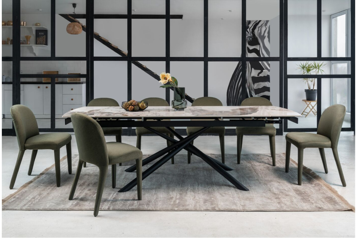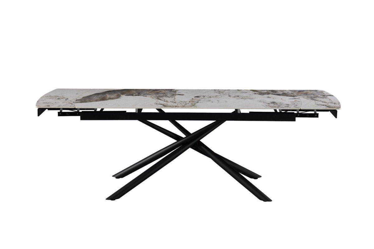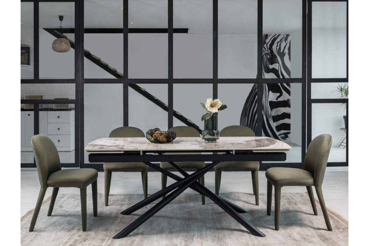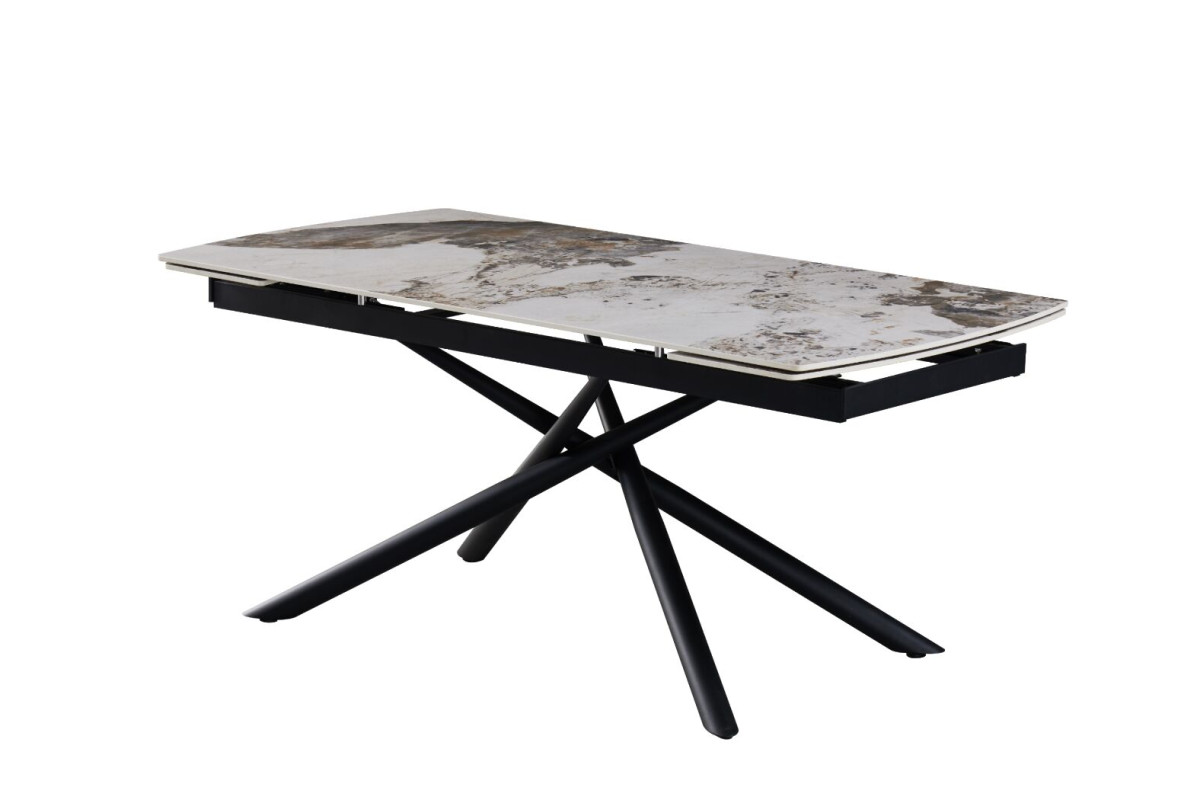 Керамічний стіл Піно TML-1200 патагонія + чорний — стильний і практичний розкладний стіл із глянцевою керамічною стільницею кольору \"патагонія\". Цей відтінок надає столу елегантного вигляду завдяки природним прожилкам, що поєднують нейтральні кольори.Кераміка в кольорі патагонія з природними прожилками виглядає розкішно та елегантно, а чорна металева основа додає контрасту, підкреслюючи сучасний стиль. Це поєднання створює враження витонченості та елегантності.Боковий механізм розкладки дозволяє збільшити довжину стільниці з 180 см до 240 см, забезпечуючи більше місця для гостей.