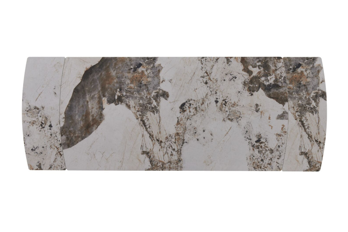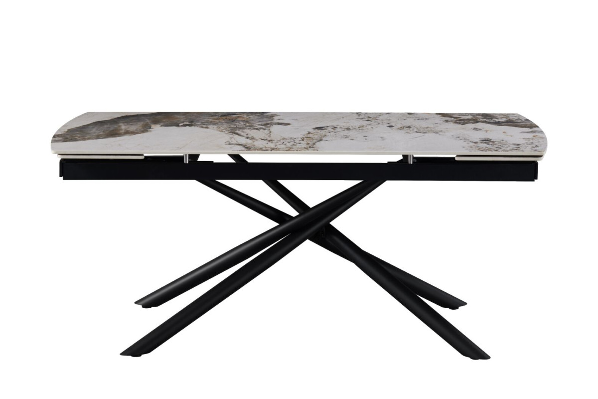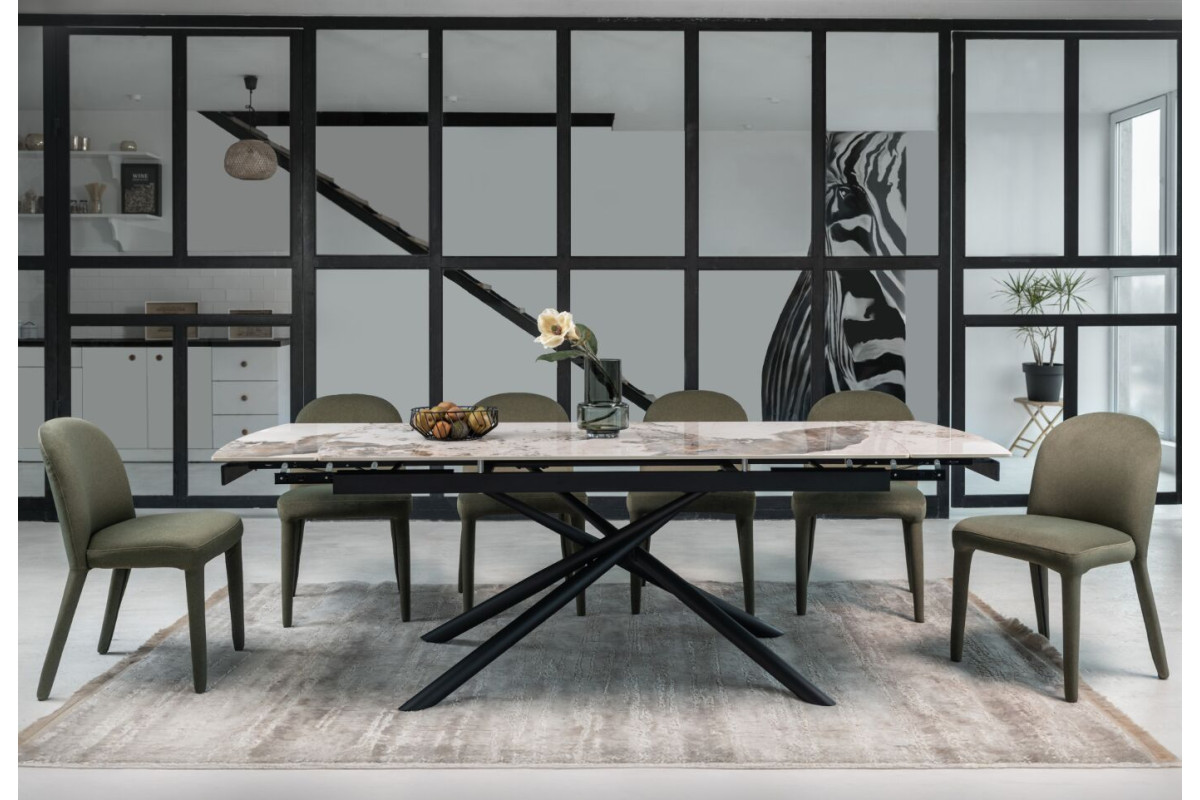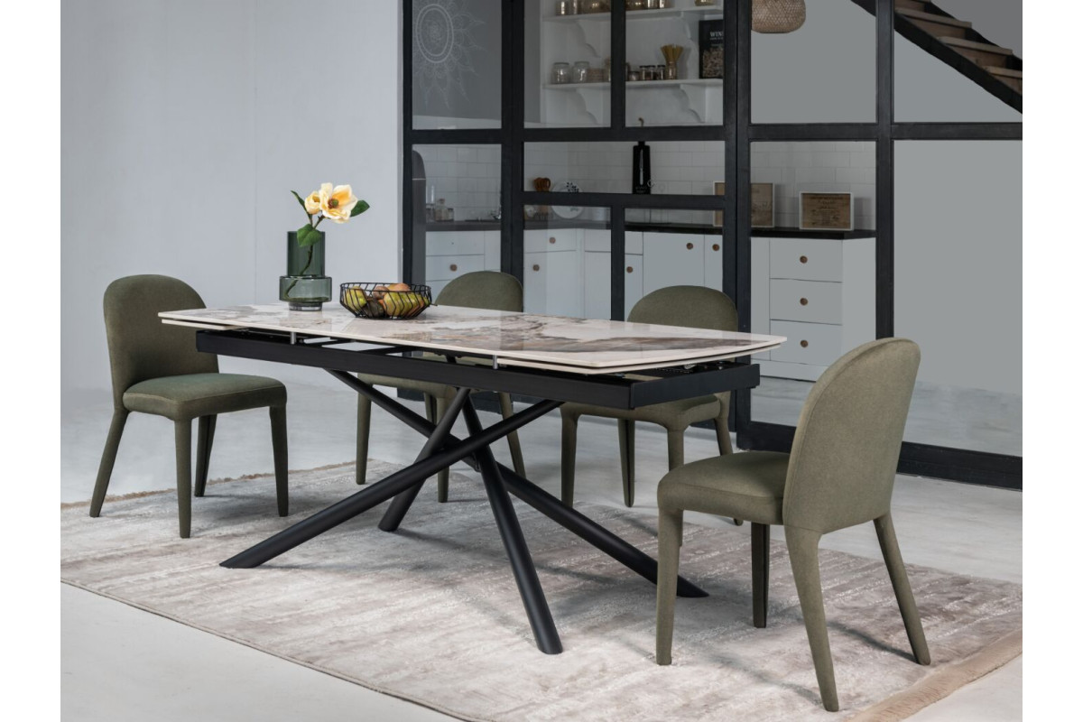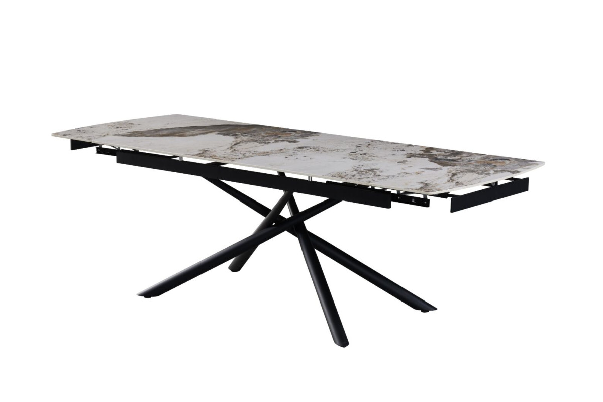Керамічний стіл Піно TML-1200 патагонія + чорний — стильний і практичний розкладний стіл із глянцевою керамічною стільницею кольору \"патагонія\". Цей відтінок надає столу елегантного вигляду завдяки природним прожилкам, що поєднують нейтральні кольори.Кераміка в кольорі патагонія з природними прожилками виглядає розкішно та елегантно, а чорна металева основа додає контрасту, підкреслюючи сучасний стиль. Це поєднання створює враження витонченості та елегантності.Боковий механізм розкладки дозволяє збільшити довжину стільниці з 180 см до 240 см, забезпечуючи більше місця для гостей.
