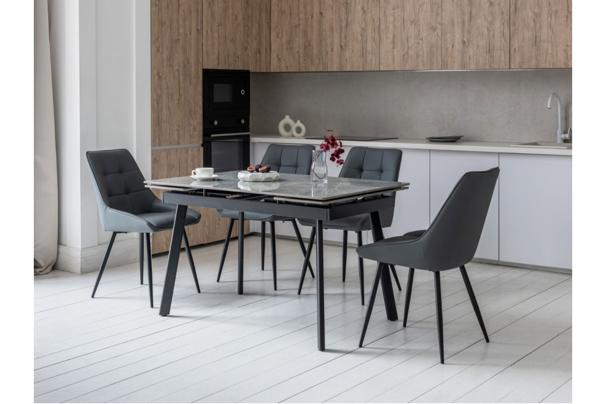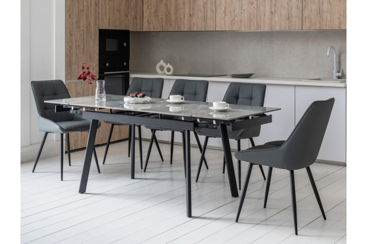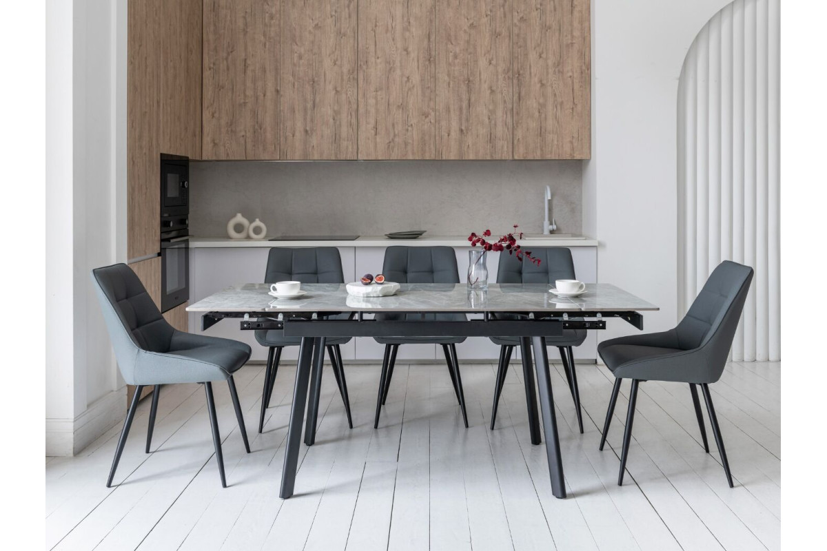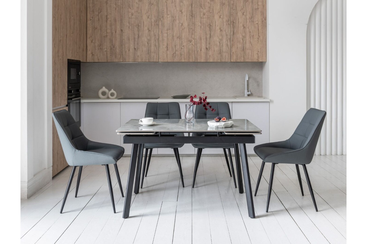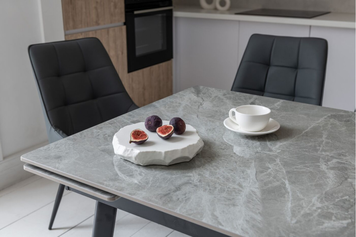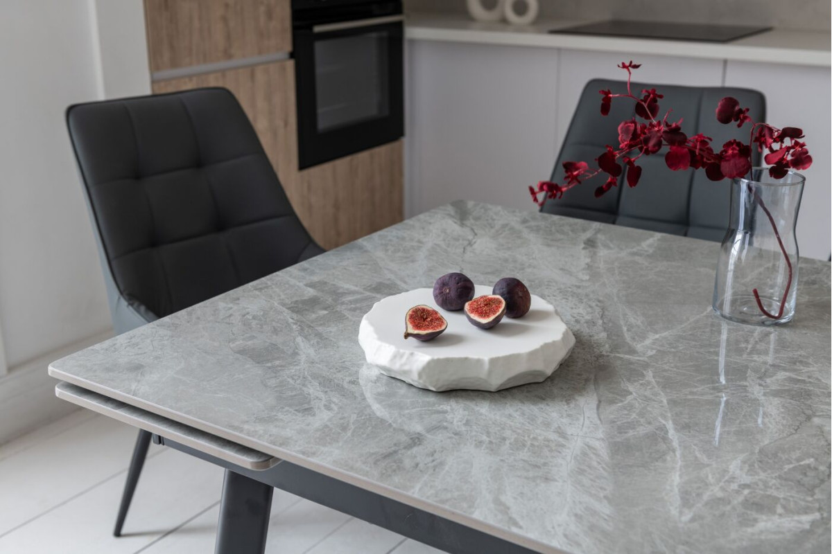 Керамічний стіл TM-98-1 у відтінку б’янко каррара грей + чорний — це вишукане поєднання сучасного дизайну та практичності. Прямокутна форма та глянцева поверхня стільниці створюють елегантний акцент, додаючи простору світла й візуальної гармонії. Витончений малюнок кераміки «каррара грей» підкреслює стильний характер меблів, а чорна металева основа додає контрасту та виразності.Завдяки боковому механізму розкладання стіл легко трансформується з 120 до 180 см, забезпечуючи комфортне розміщення гостей як у повсякденному житті, так і під час святкових подій. Глянцева керамічна стільниця стійка до високих температур, а міцна металева конструкція гарантує надійність і довговічність.TM-98-1 — це стильний центр обідньої зони, що поєднує естетику, функціональність та зручність у використанні.