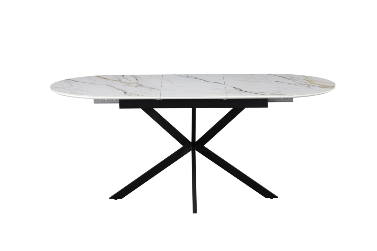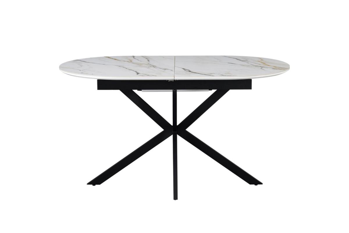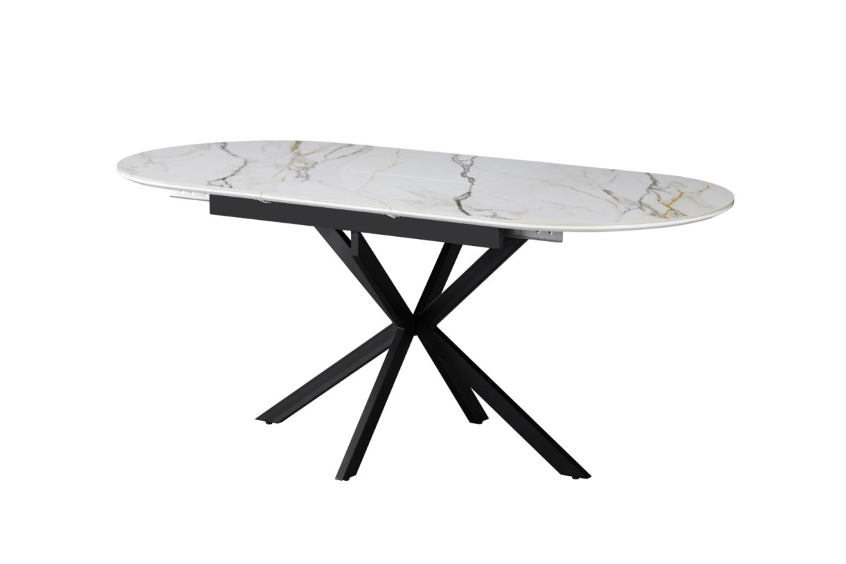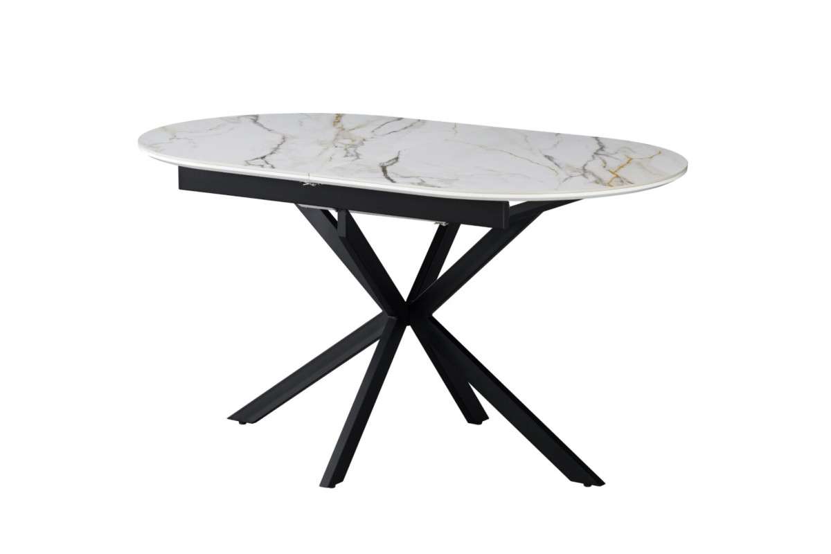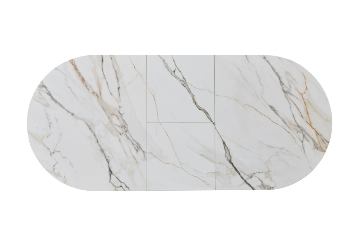 Керамічний стіл Верона TML-1335 калакатта голд + чорний — це вишукане поєднання елегантності, стилю та сучасних технологій. Його овальна форма додає м’якості лініям інтер’єру, а відтінок калакатта голд із благородними прожилками нагадує текстуру природного мармуру, створюючи відчуття розкоші та витонченості.Стільниця з матової кераміки та МДФ не лише виглядає ефектно, але й вирізняється практичністю — вона стійка до подряпин, плям і перепадів температур, що робить її ідеальною для щоденного використання.Механізм розкладки “книжка-автомат” дозволяє легко збільшити довжину столу до 180 см, забезпечуючи додатковий простір для гостей чи сімейних свят.Міцна металева основа в чорному кольорі додає контрасту й підкреслює сучасний характер моделі, водночас забезпечуючи стабільність конструкції.