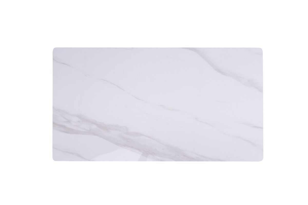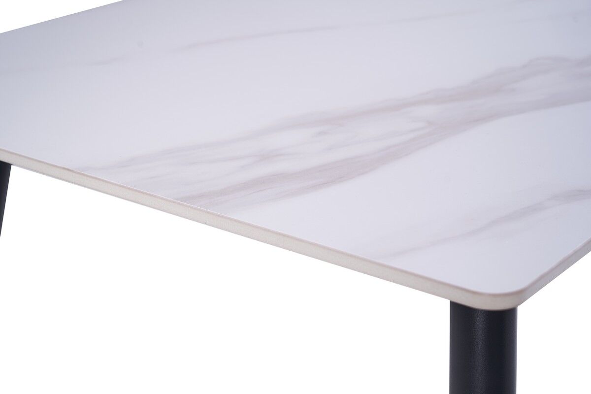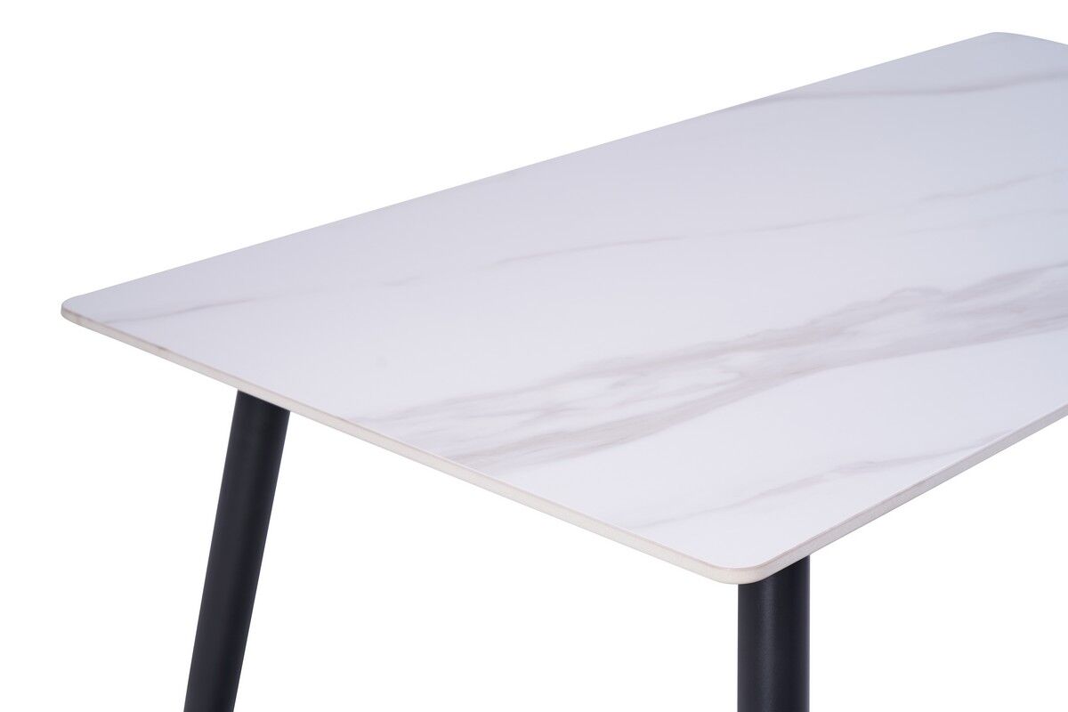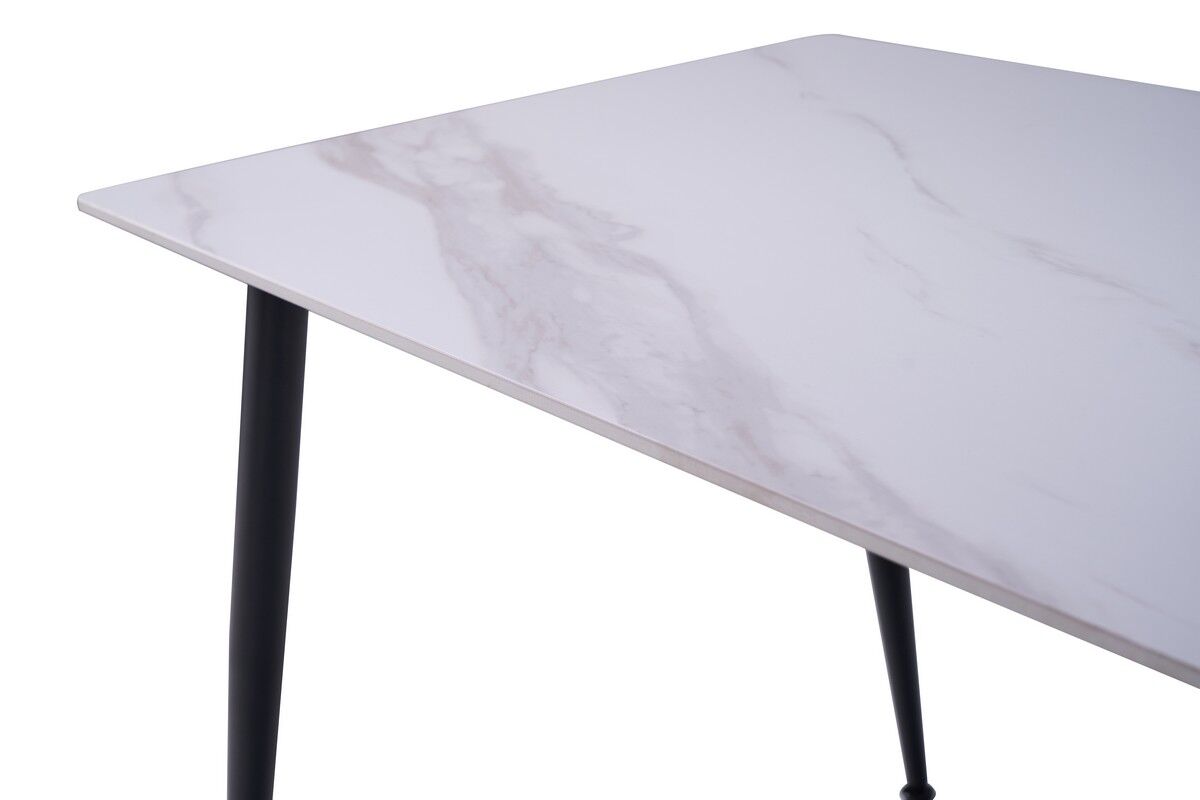 Обідній керамічний стіл TM-100 в кольорі Олімпо Вайт є ідеальним поєднанням сучасного стилю та практичності. Його елегантний білий колір стільниці, виконаний з глянцевої кераміки, імітує натуральний мармур з характерними прожилками. Цей колір надає столу свіжості та чистоти, створюючи світлу та повітряну атмосферу в інтер'єрі.Чорна основа створює стильний контраст з білою стільницею та додає сучасності. Метал забезпечує міцність і стійкість конструкції.Прямокутна форма і компактні розміри роблять стіл підходящим для різних приміщень, від маленьких кухонь до просторих їдалень.