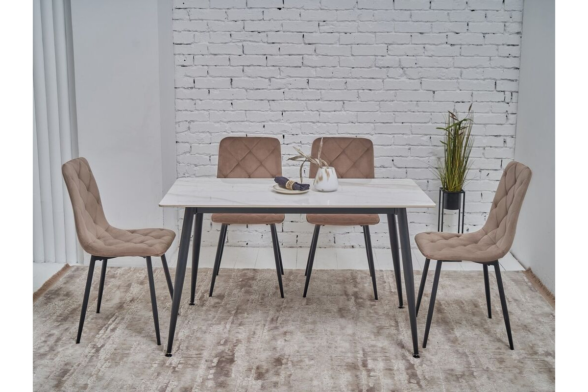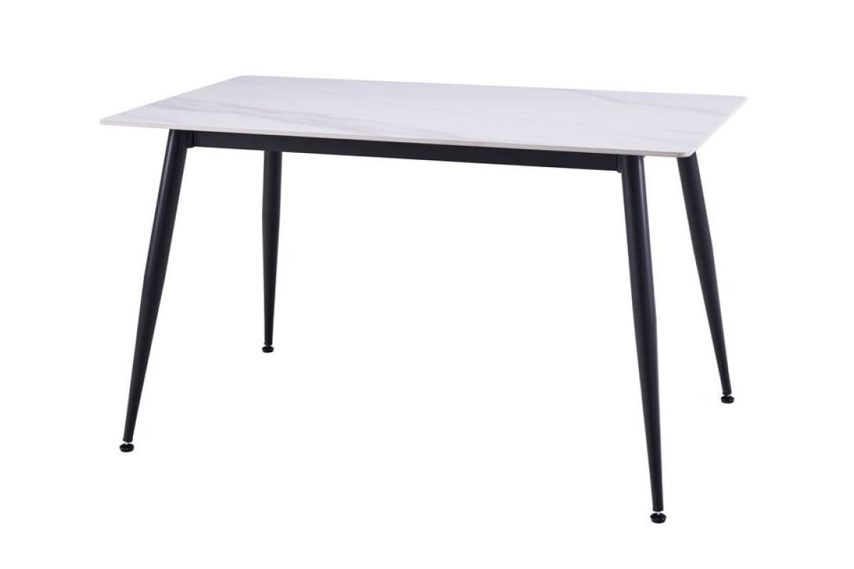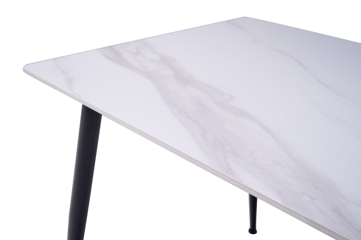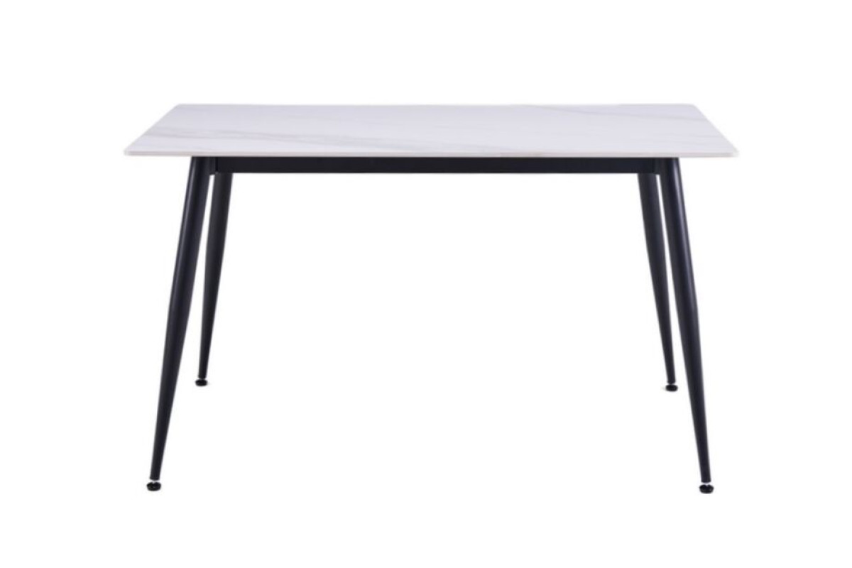 Обідній керамічний стіл TM-100 в кольорі Олімпо Вайт є ідеальним поєднанням сучасного стилю та практичності. Його елегантний білий колір стільниці, виконаний з глянцевої кераміки, імітує натуральний мармур з характерними прожилками. Цей колір надає столу свіжості та чистоти, створюючи світлу та повітряну атмосферу в інтер'єрі.Чорна основа створює стильний контраст з білою стільницею та додає сучасності. Метал забезпечує міцність і стійкість конструкції.Прямокутна форма і компактні розміри роблять стіл підходящим для різних приміщень, від маленьких кухонь до просторих їдалень.