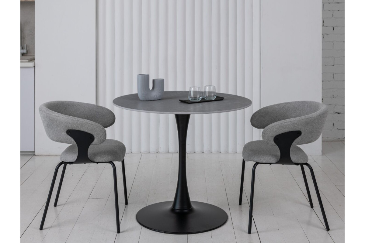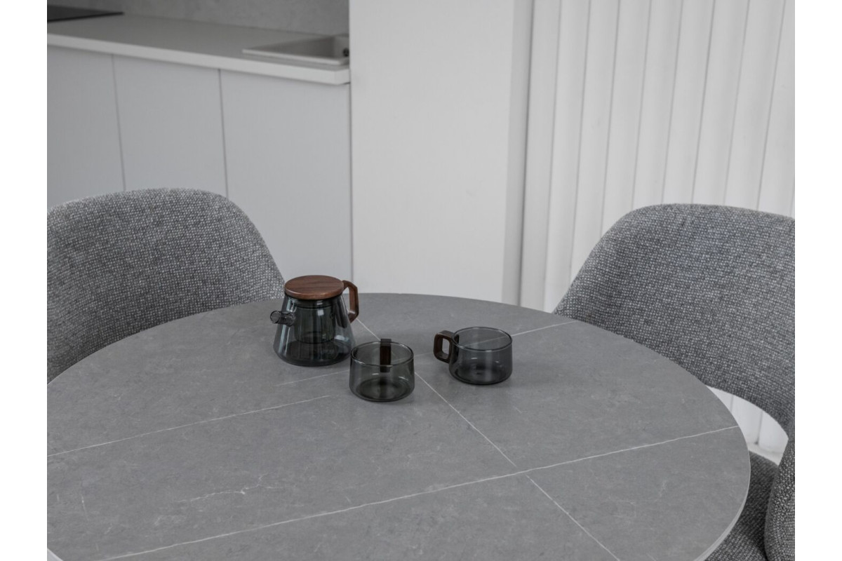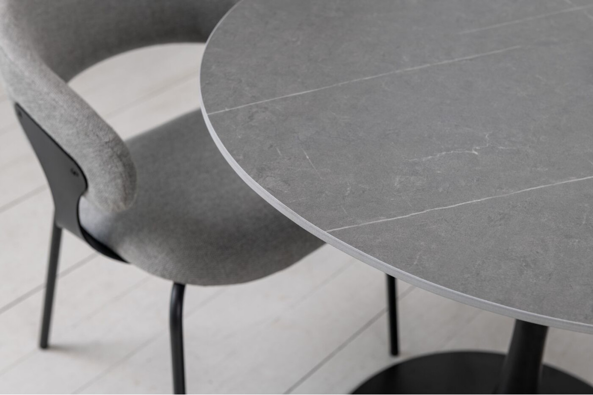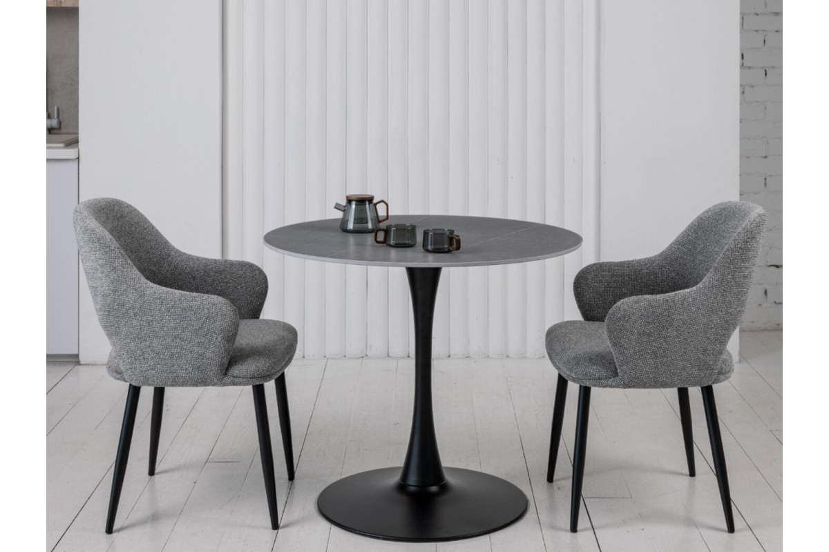 Стільниця виконана з матової кераміки у відтінку Айс Грей, що надає столу елегантний вигляд і відчуття прохолоди та спокою. Кераміка імітує натуральний камінь, зберігаючи при цьому легкість у догляді та стійкість до пошкоджень. Матова поверхня не відбиває світло, що створює м'яку атмосферу у приміщенні та допомагає уникнути небажаних відблисків.Кругла форма стільниці робить цей стіл ідеальним вибором для невеликих обідніх зон або кухонь. Така форма сприяє легкому спілкуванню, дозволяючи всім присутнім за столом легко взаємодіяти один з одним.Чорна фарбована металева ніжка додає столу сучасного акценту та забезпечує його стійкість. Контраст між темною ніжкою та світлою стільницею створює стильний і збалансований вигляд, що легко вписується в різні інтер'єри.Завдяки компактним розмірам, цей стіл чудово підходить для невеликих приміщень, не займаючи багато місця, але забезпечуючи достатньо простору для комфортного розміщення 2-4 осіб.