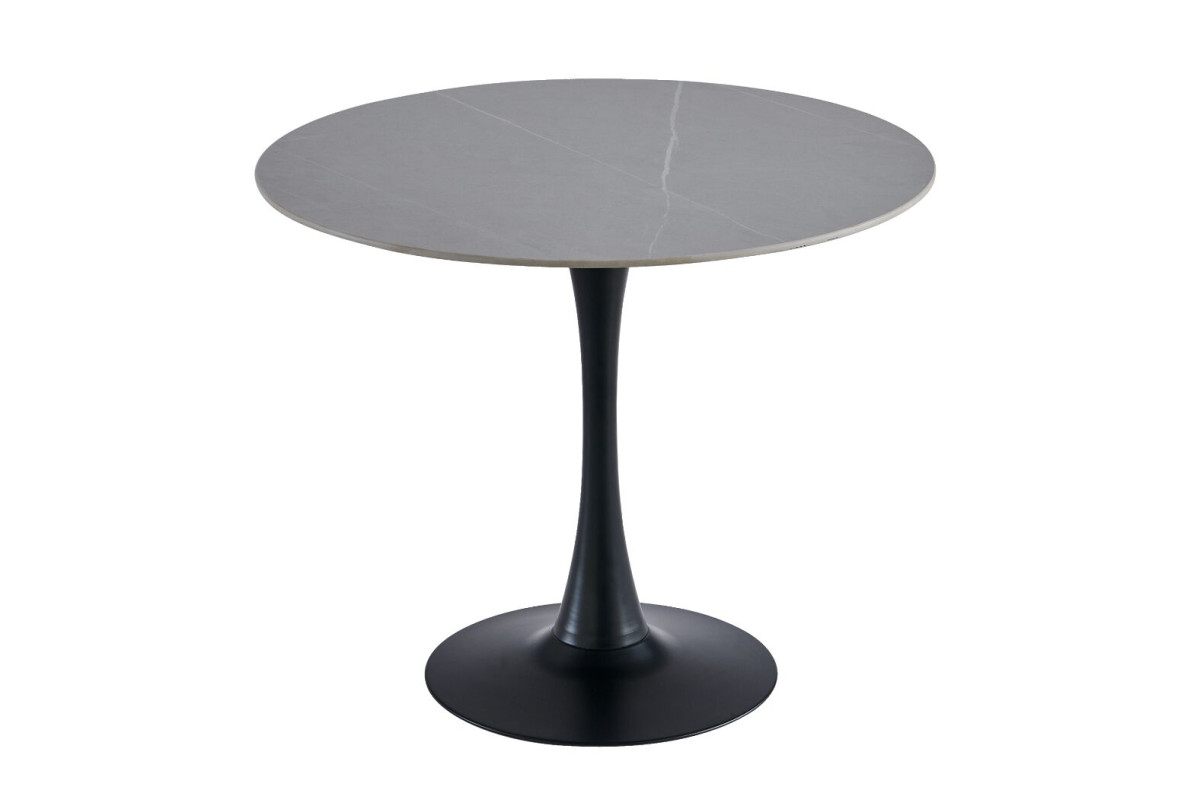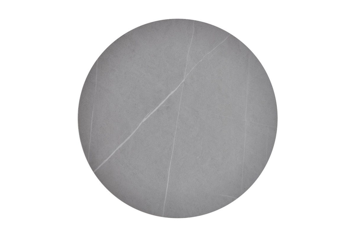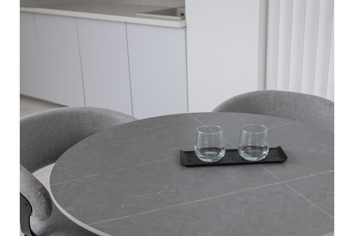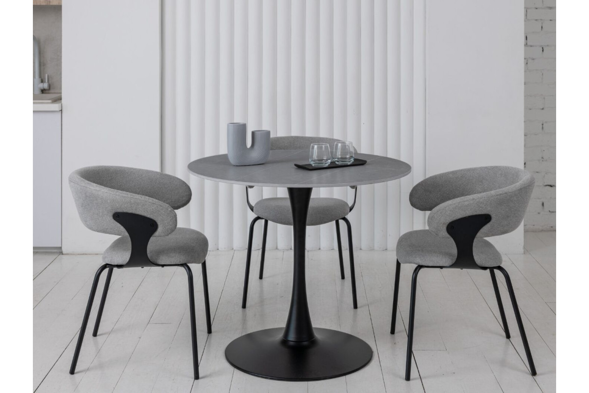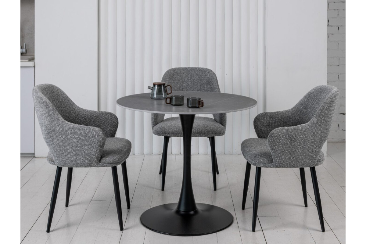 Стільниця виконана з матової кераміки у відтінку Айс Грей, що надає столу елегантний вигляд і відчуття прохолоди та спокою. Кераміка імітує натуральний камінь, зберігаючи при цьому легкість у догляді та стійкість до пошкоджень. Матова поверхня не відбиває світло, що створює м'яку атмосферу у приміщенні та допомагає уникнути небажаних відблисків.Кругла форма стільниці робить цей стіл ідеальним вибором для невеликих обідніх зон або кухонь. Така форма сприяє легкому спілкуванню, дозволяючи всім присутнім за столом легко взаємодіяти один з одним.Чорна фарбована металева ніжка додає столу сучасного акценту та забезпечує його стійкість. Контраст між темною ніжкою та світлою стільницею створює стильний і збалансований вигляд, що легко вписується в різні інтер'єри.Завдяки компактним розмірам, цей стіл чудово підходить для невеликих приміщень, не займаючи багато місця, але забезпечуючи достатньо простору для комфортного розміщення 2-4 осіб.