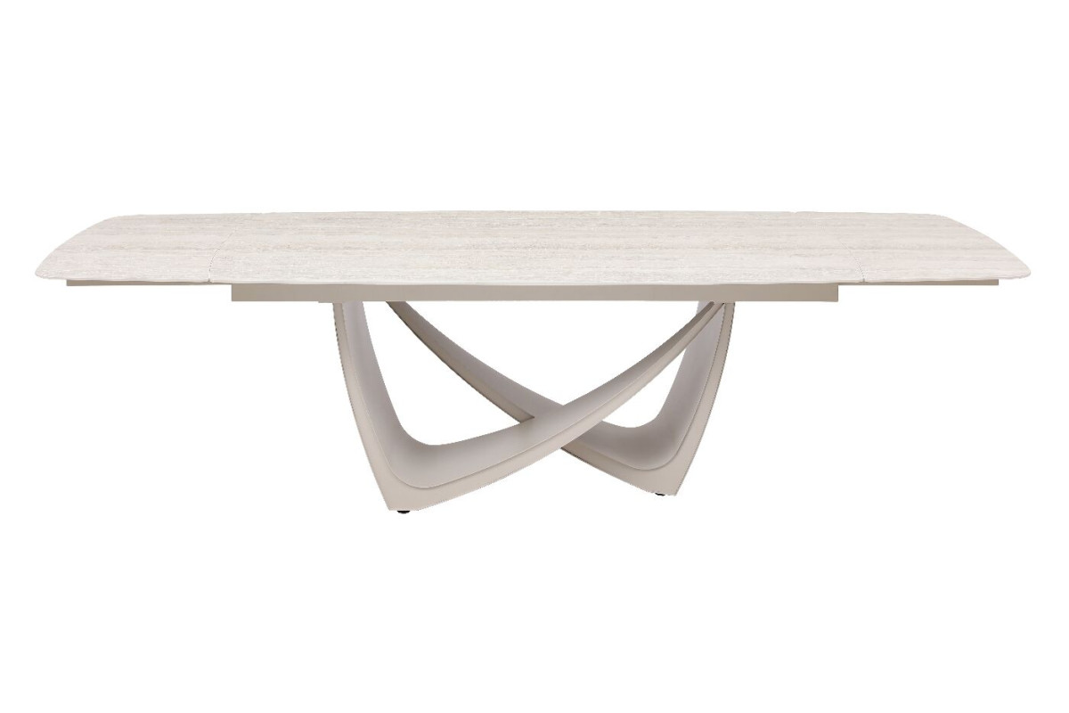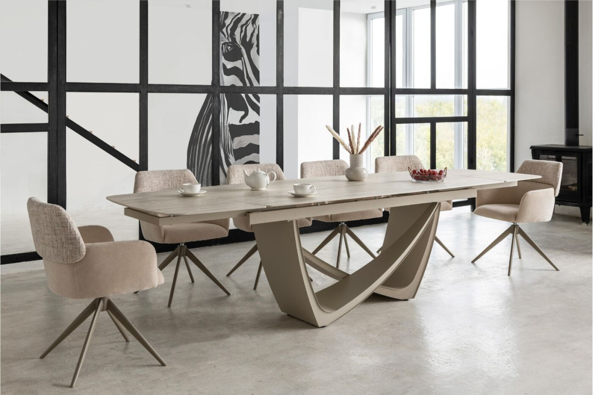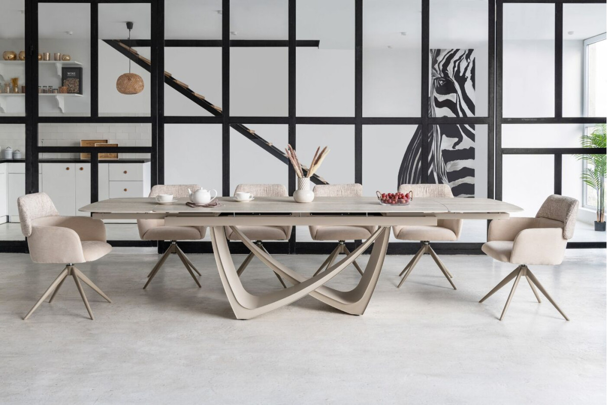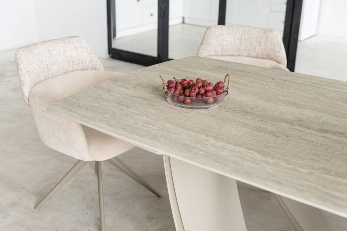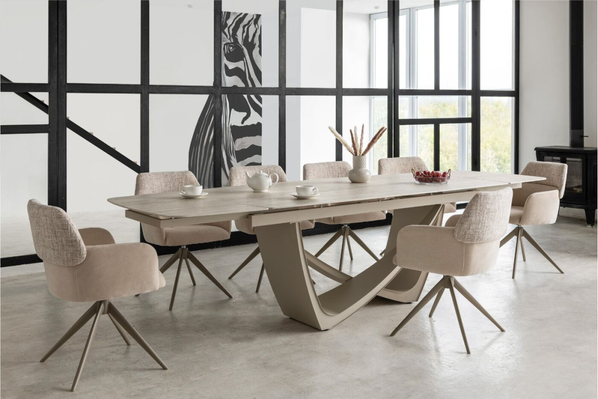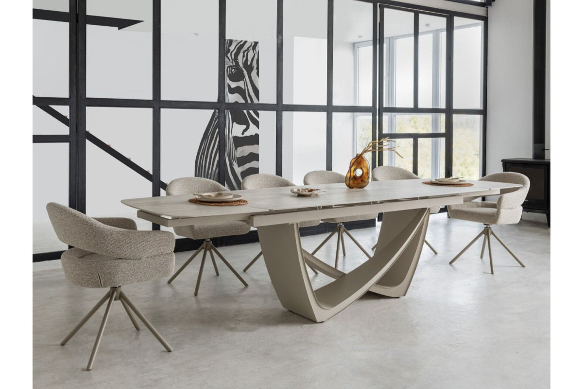 Керамічний стіл Беатріче TML-994 у відтінку грей травертін + бежевий — це втілення елегантності, практичності та сучасного стилю для просторих кухонь і їдалень. Велична прямокутна форма, стільниця з матової кераміки з ефектом натурального каменю та надійна металева основа в теплих бежевих тонах створюють розкішне поєднання дизайну та функціональності.Стіл має розкладну конструкцію з боковим механізмом, що дозволяє швидко збільшити довжину стільниці з 200 см до вражаючих 300 см. Це робить модель ідеальним вибором для великих родин або прийому гостей, адже за ним зручно розміститься до 12 осіб.Матова керамічна поверхня стільниці не лише вишукана на вигляд, а й надзвичайно практична — вона стійка до подряпин, високих температур, плям і легка у догляді. Основа зі сталевого фарбованого металу забезпечує надійну підтримку всієї конструкції, витримуючи вагу до 162.8 кг.Беатріче — це не просто стіл, це центральний акцент вашого інтер’єру, який поєднує в собі функціональність, довговічність і витонченість. Ідеально підходить для сучасного або скандинавського стилю, а також для інтер'єрів у природних, теплих відтінках.