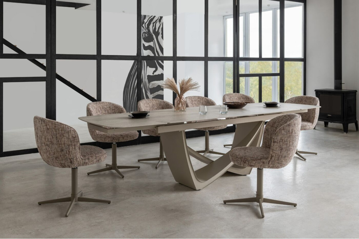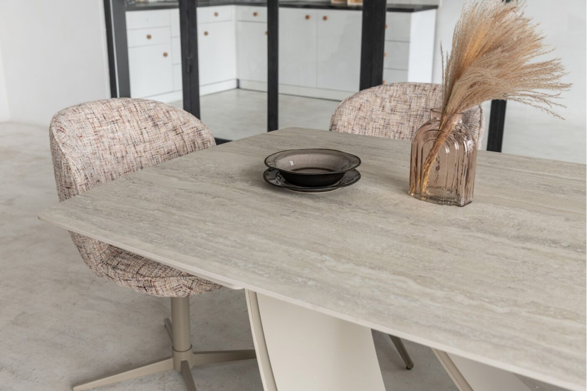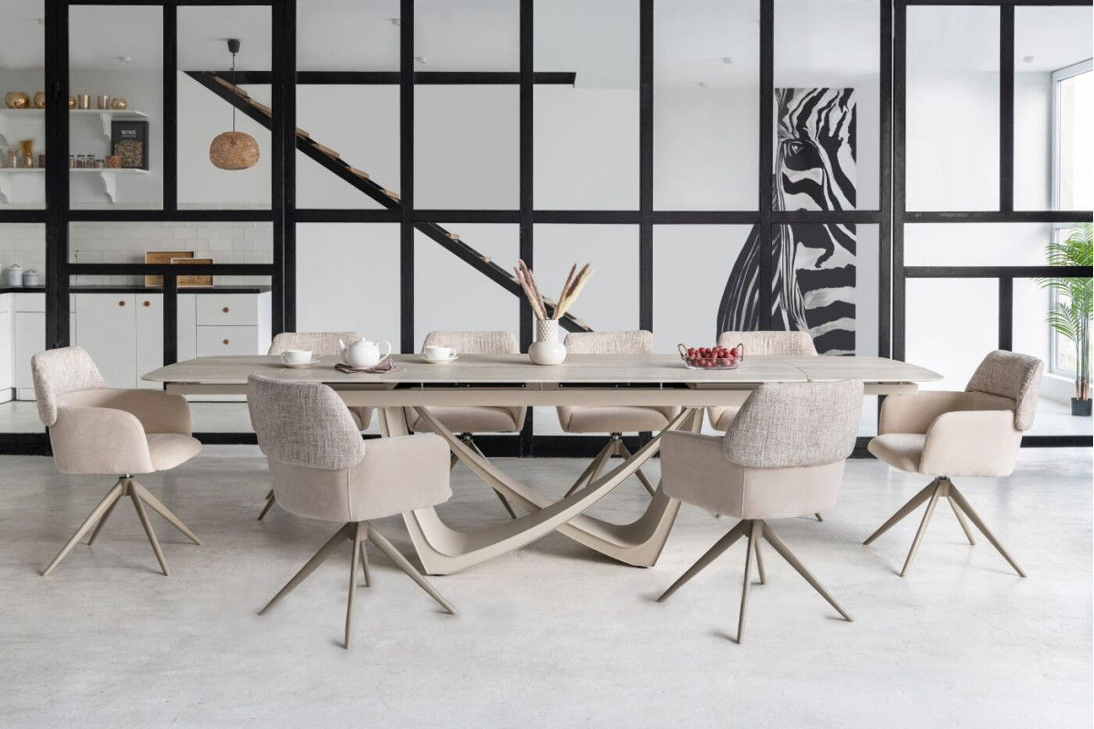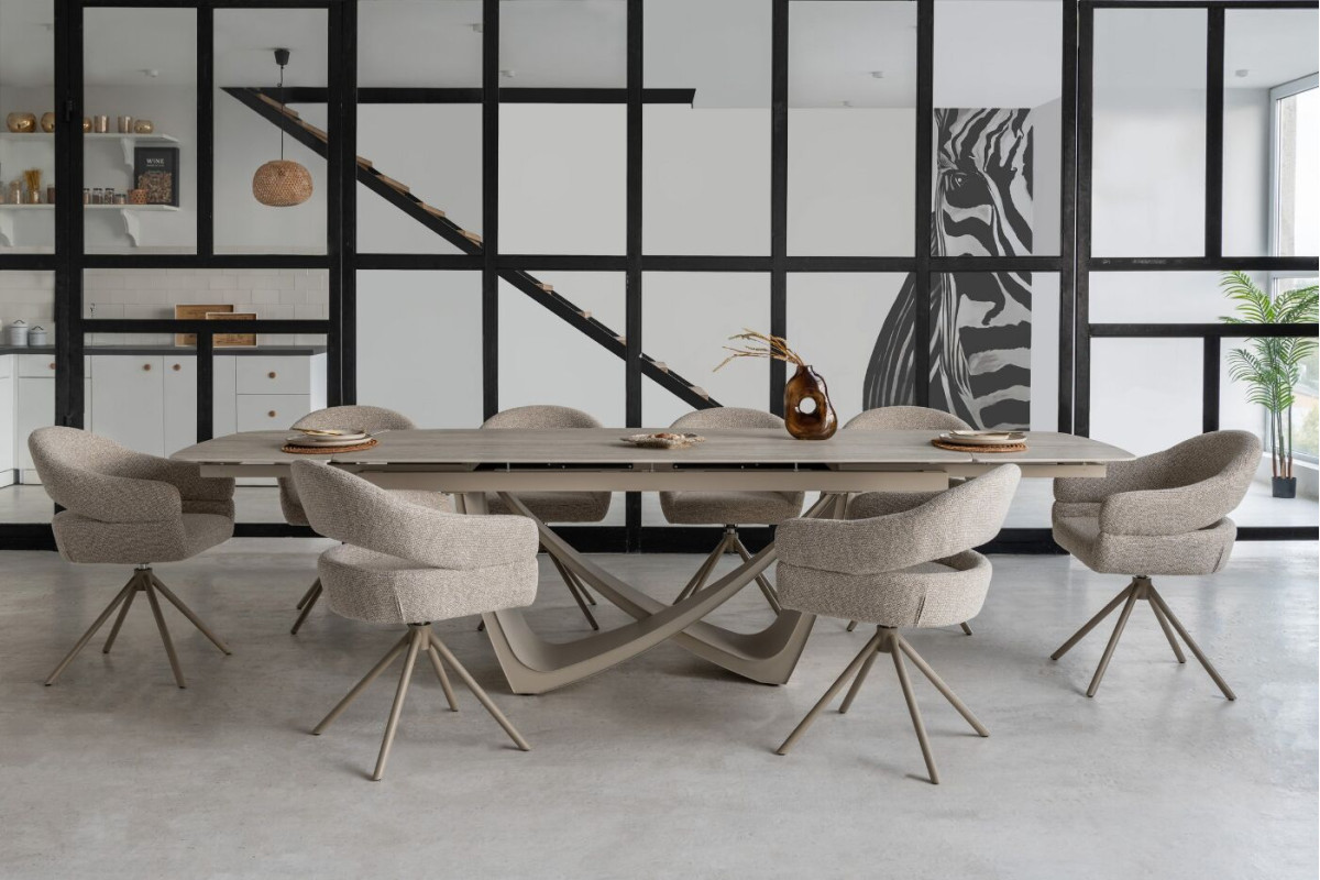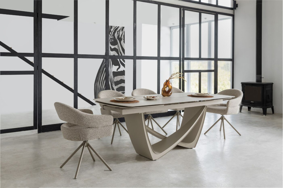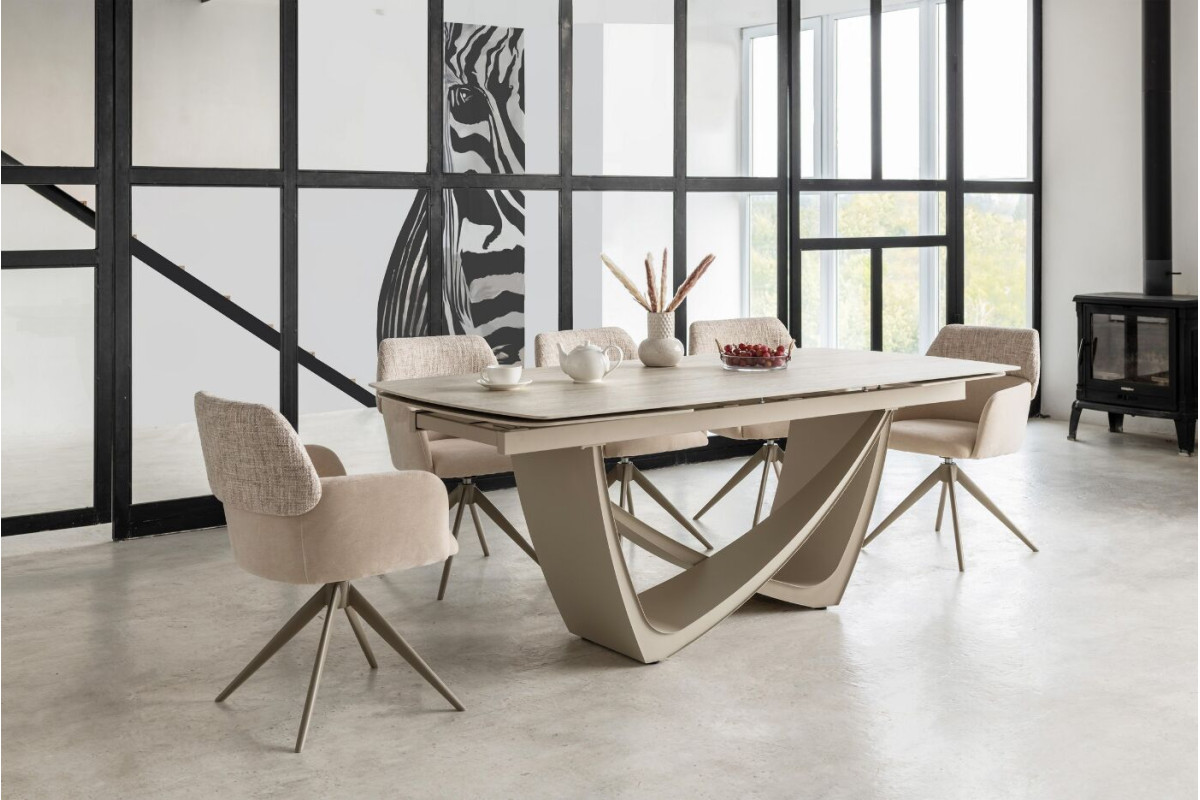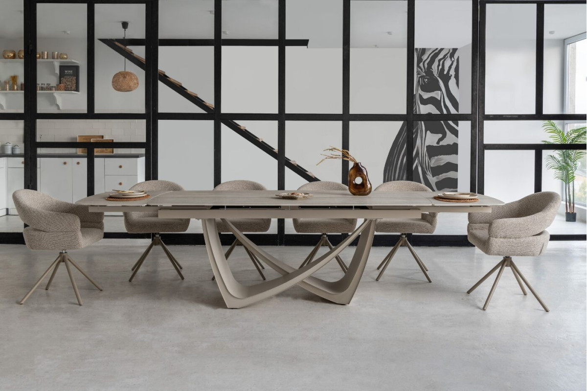 Керамічний стіл Беатріче TML-994 у відтінку грей травертін + бежевий — це втілення елегантності, практичності та сучасного стилю для просторих кухонь і їдалень. Велична прямокутна форма, стільниця з матової кераміки з ефектом натурального каменю та надійна металева основа в теплих бежевих тонах створюють розкішне поєднання дизайну та функціональності.Стіл має розкладну конструкцію з боковим механізмом, що дозволяє швидко збільшити довжину стільниці з 200 см до вражаючих 300 см. Це робить модель ідеальним вибором для великих родин або прийому гостей, адже за ним зручно розміститься до 12 осіб.Матова керамічна поверхня стільниці не лише вишукана на вигляд, а й надзвичайно практична — вона стійка до подряпин, високих температур, плям і легка у догляді. Основа зі сталевого фарбованого металу забезпечує надійну підтримку всієї конструкції, витримуючи вагу до 162.8 кг.Беатріче — це не просто стіл, це центральний акцент вашого інтер’єру, який поєднує в собі функціональність, довговічність і витонченість. Ідеально підходить для сучасного або скандинавського стилю, а також для інтер'єрів у природних, теплих відтінках.