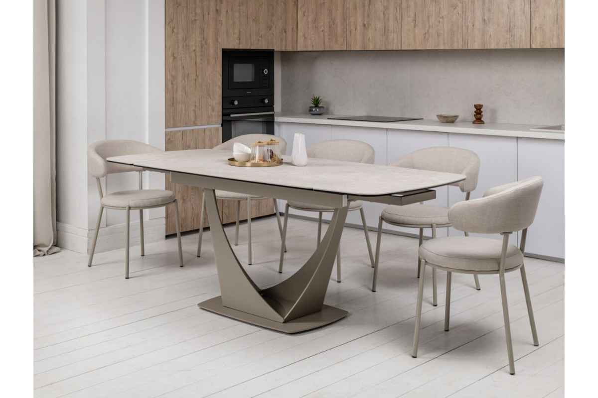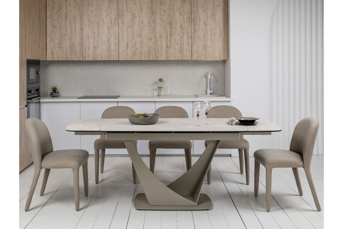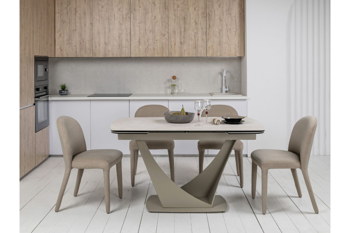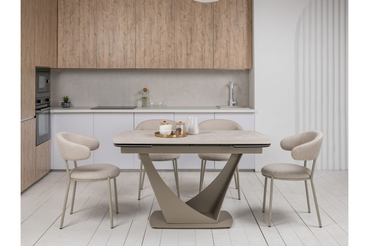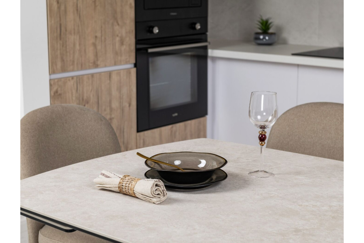 Колір \"сахара\" і бежевий відтінок основи роблять цей стіл витонченим і універсальним. Матова поверхня керамічної стільниці додає сучасного вигляду й легко поєднується з іншими елементами інтер'єру.Стільниця з кераміки на гартованому склі забезпечує підвищену стійкість до подряпин, високих температур і впливу вологи. Це робить його довговічним, особливо для активного використання.Завдяки боковому механізму розкладки стіл можна легко подовжити з 140 см до 200 см. Це дозволяє адаптувати його розмір під потреби — від компактного столу до великого обіднього.Цей стіл не лише прикрасить будь-яку кухню чи вітальню, але й стане практичним рішенням для повсякденного використання та святкових заходів.
