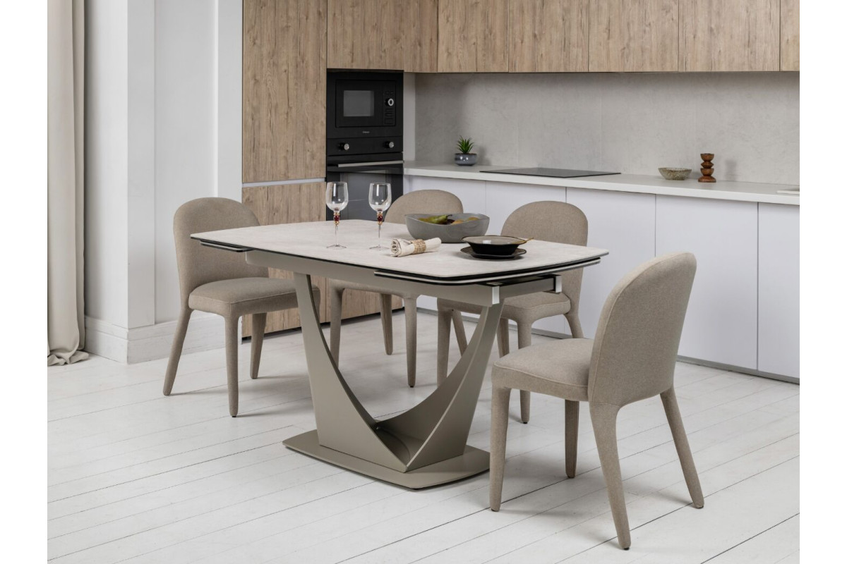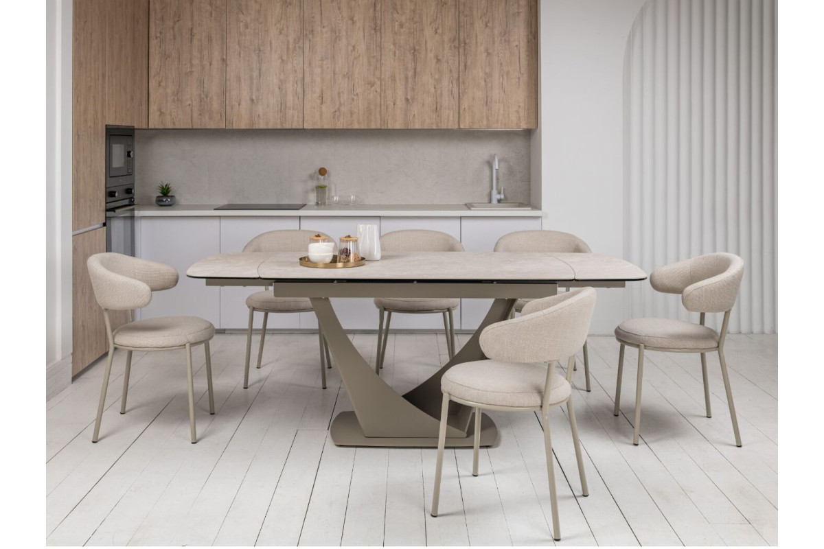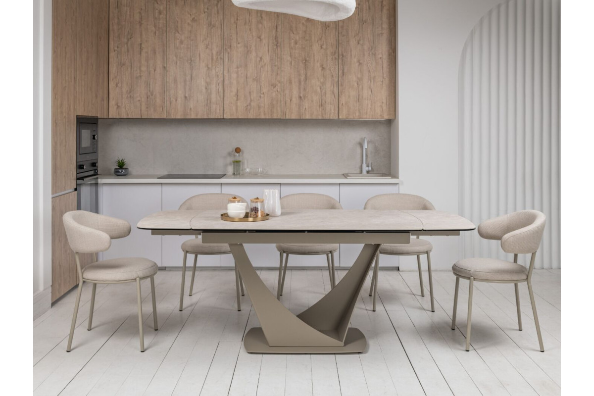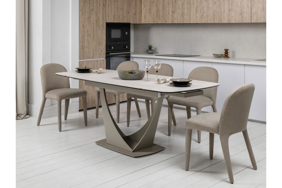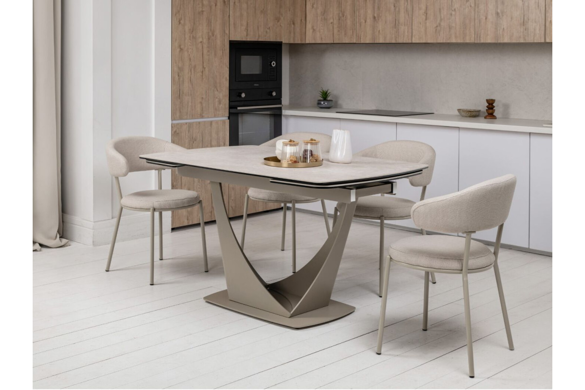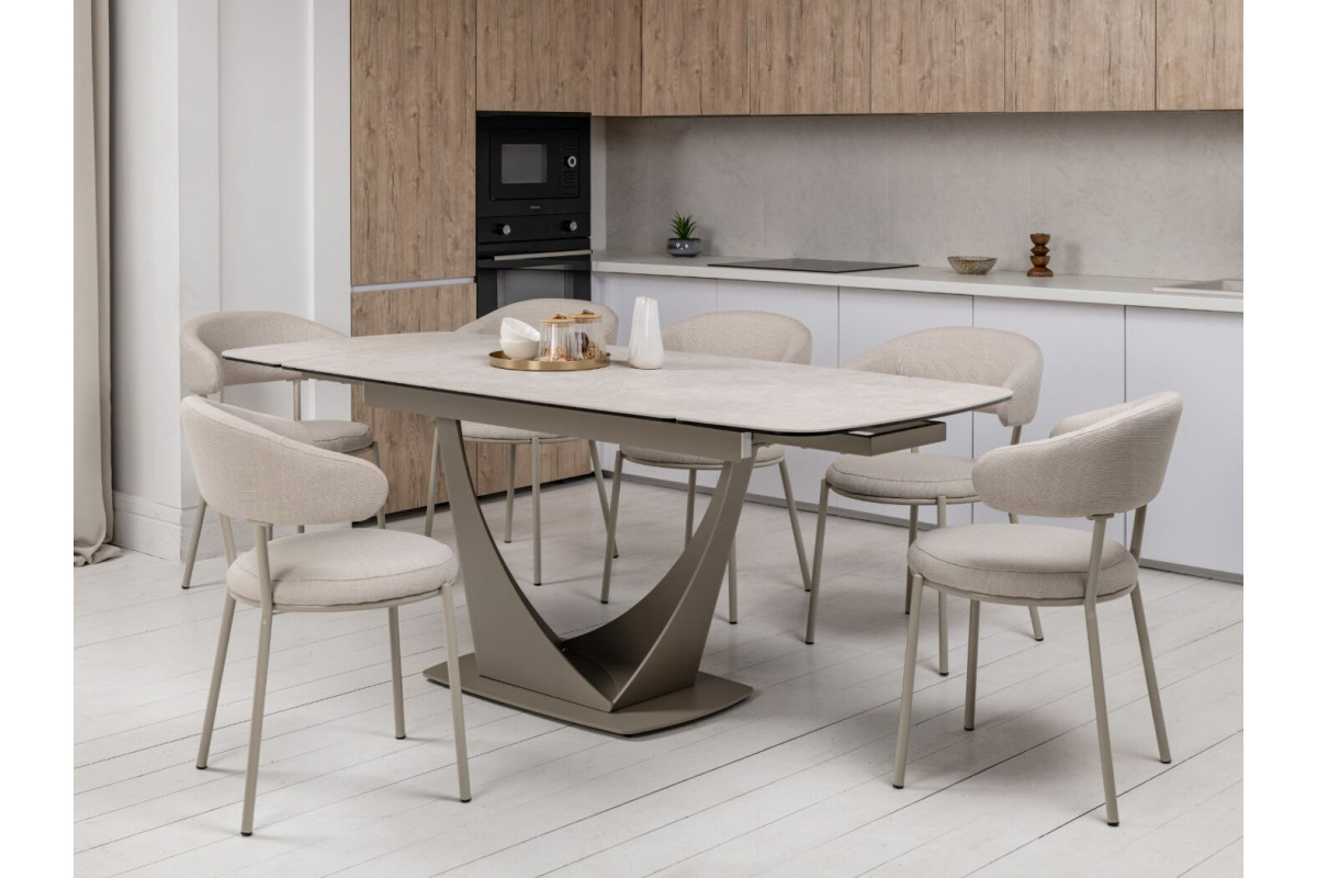 Колір \"сахара\" і бежевий відтінок основи роблять цей стіл витонченим і універсальним. Матова поверхня керамічної стільниці додає сучасного вигляду й легко поєднується з іншими елементами інтер'єру.Стільниця з кераміки на гартованому склі забезпечує підвищену стійкість до подряпин, високих температур і впливу вологи. Це робить його довговічним, особливо для активного використання.Завдяки боковому механізму розкладки стіл можна легко подовжити з 140 см до 200 см. Це дозволяє адаптувати його розмір під потреби — від компактного столу до великого обіднього.Цей стіл не лише прикрасить будь-яку кухню чи вітальню, але й стане практичним рішенням для повсякденного використання та святкових заходів.