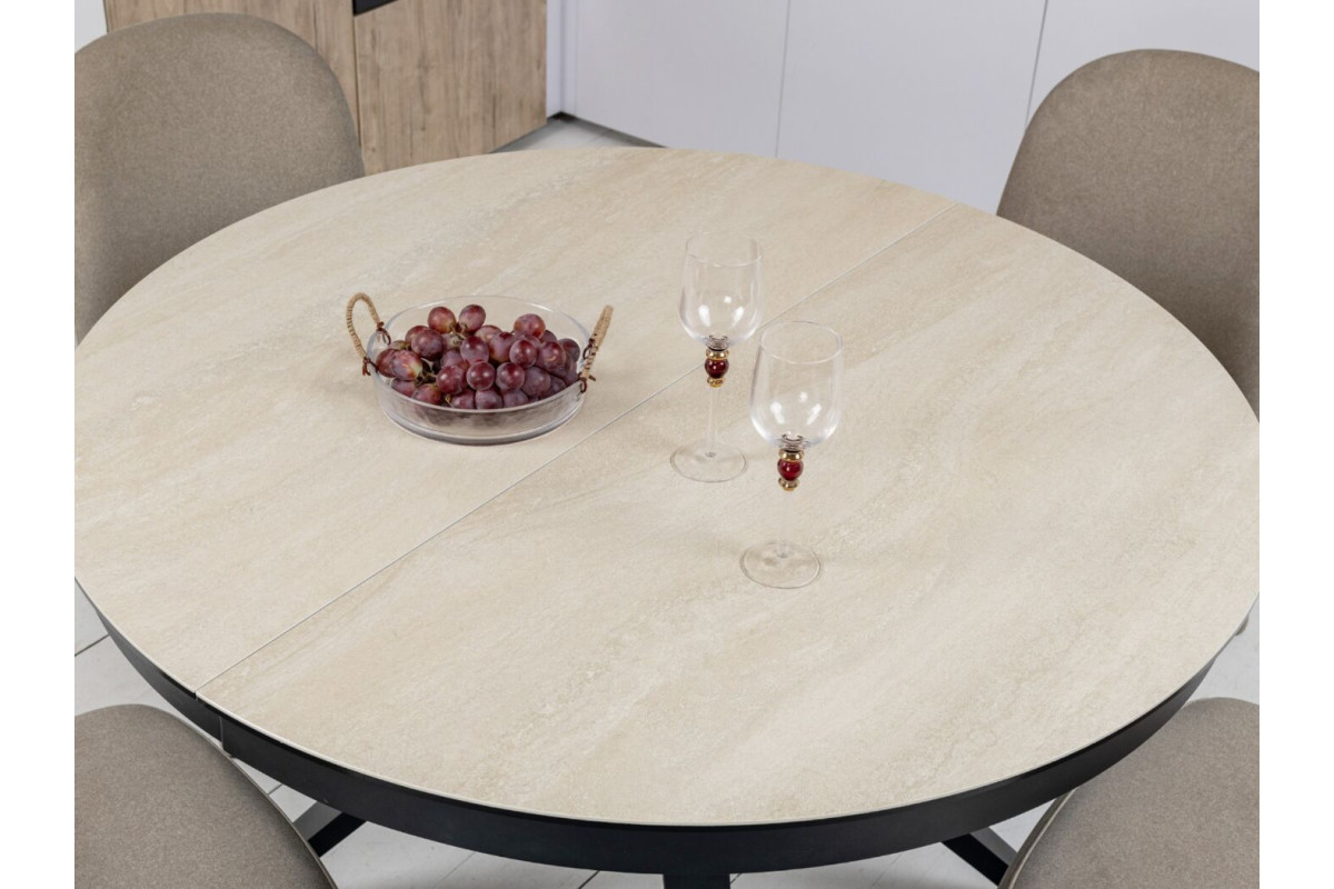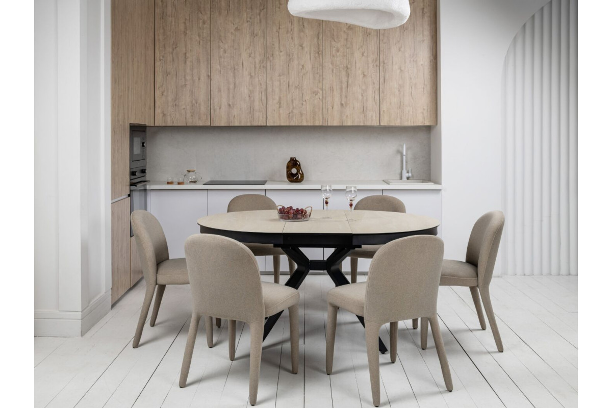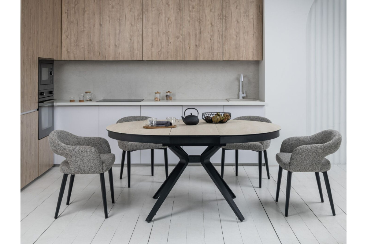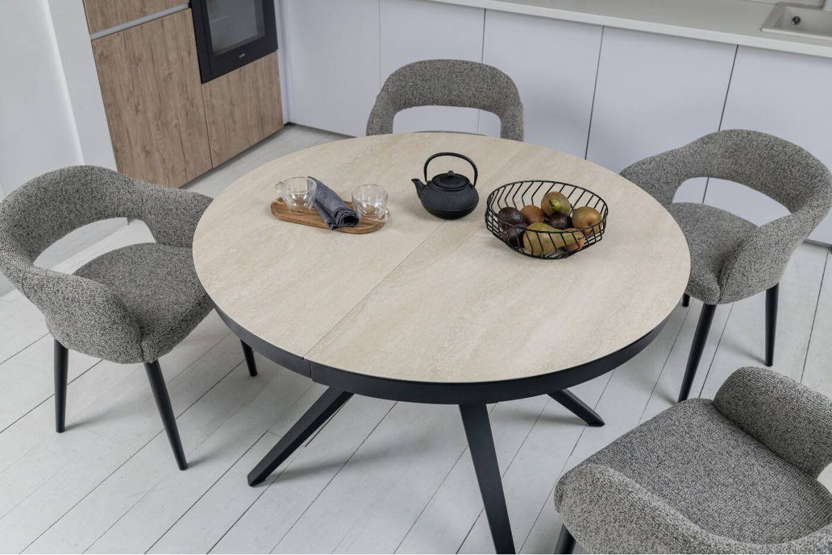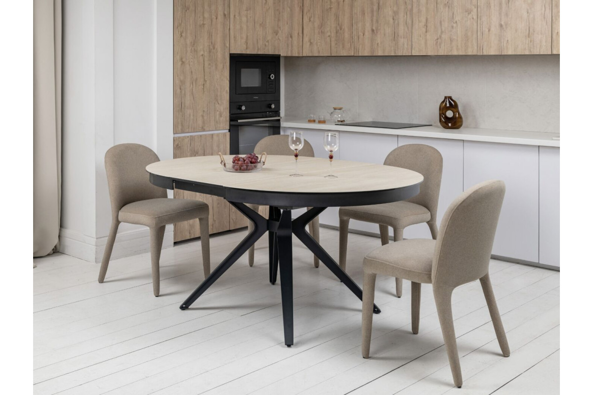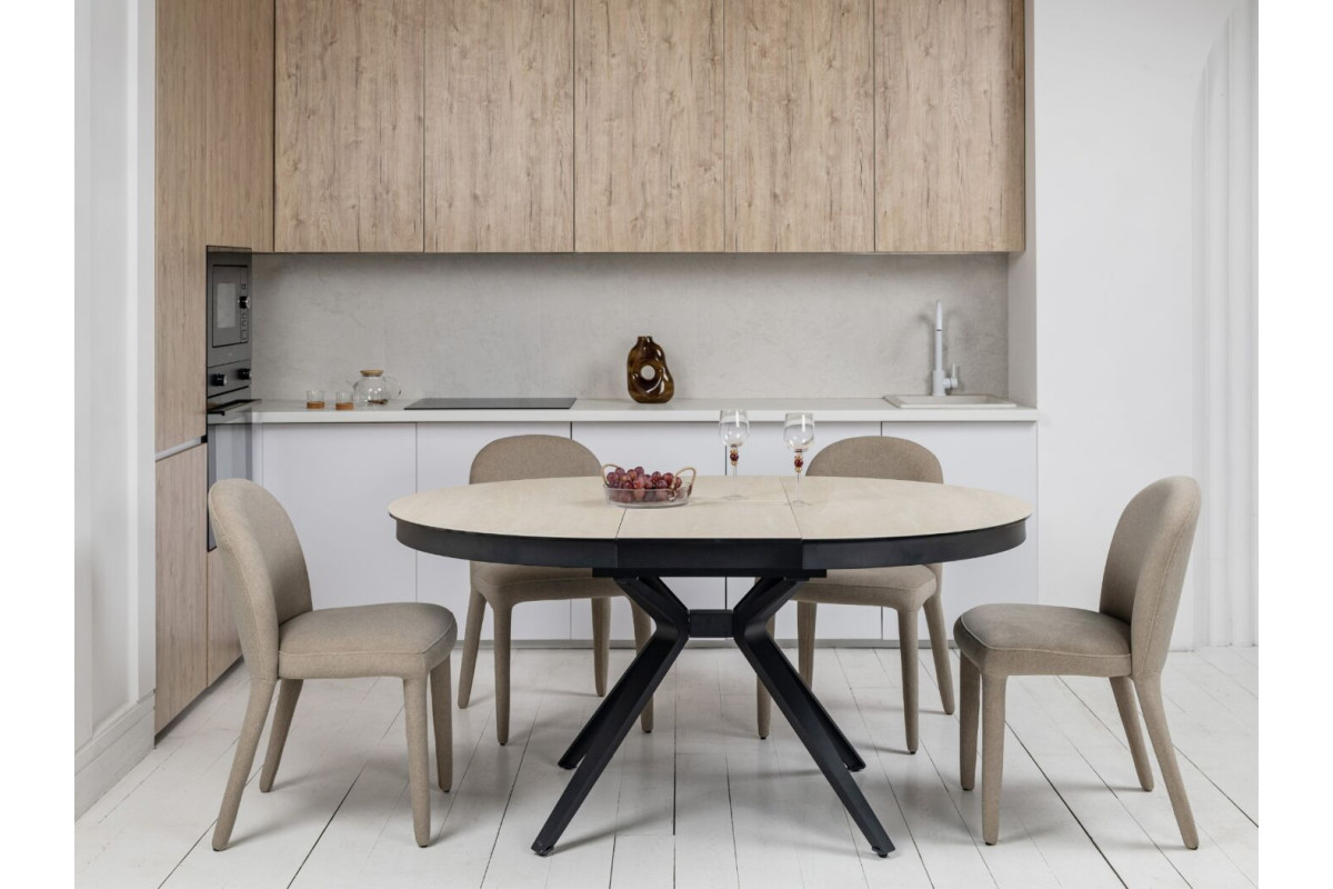 Стільниця виготовлена з матової кераміки та доповнена гартованим склом. Це не лише додає стильного вигляду, але й забезпечує стійкість до подряпин, впливу високих температур та легкість в догляді.Механізм розкладки “книжка-автомат” робить розкладання стола надзвичайно простим і зручним. Завдяки цьому механізму стіл можна легко розкласти з круглої форми діаметром 120 см до максимальної довжини 160 см, що робить його універсальним для різних ситуацій.Завдяки комбінації кольору вествуд та чорного кольору основи стіл має елегантний та сучасний вигляд. Він добре пасуватиме до інтер'єрів у стилі мінімалізм, модерн або індустріальний.Завдяки цим характеристикам, стіл Ноемі TML-996 — чудовий вибір для тих, хто цінує стиль, надійність і функціональність.