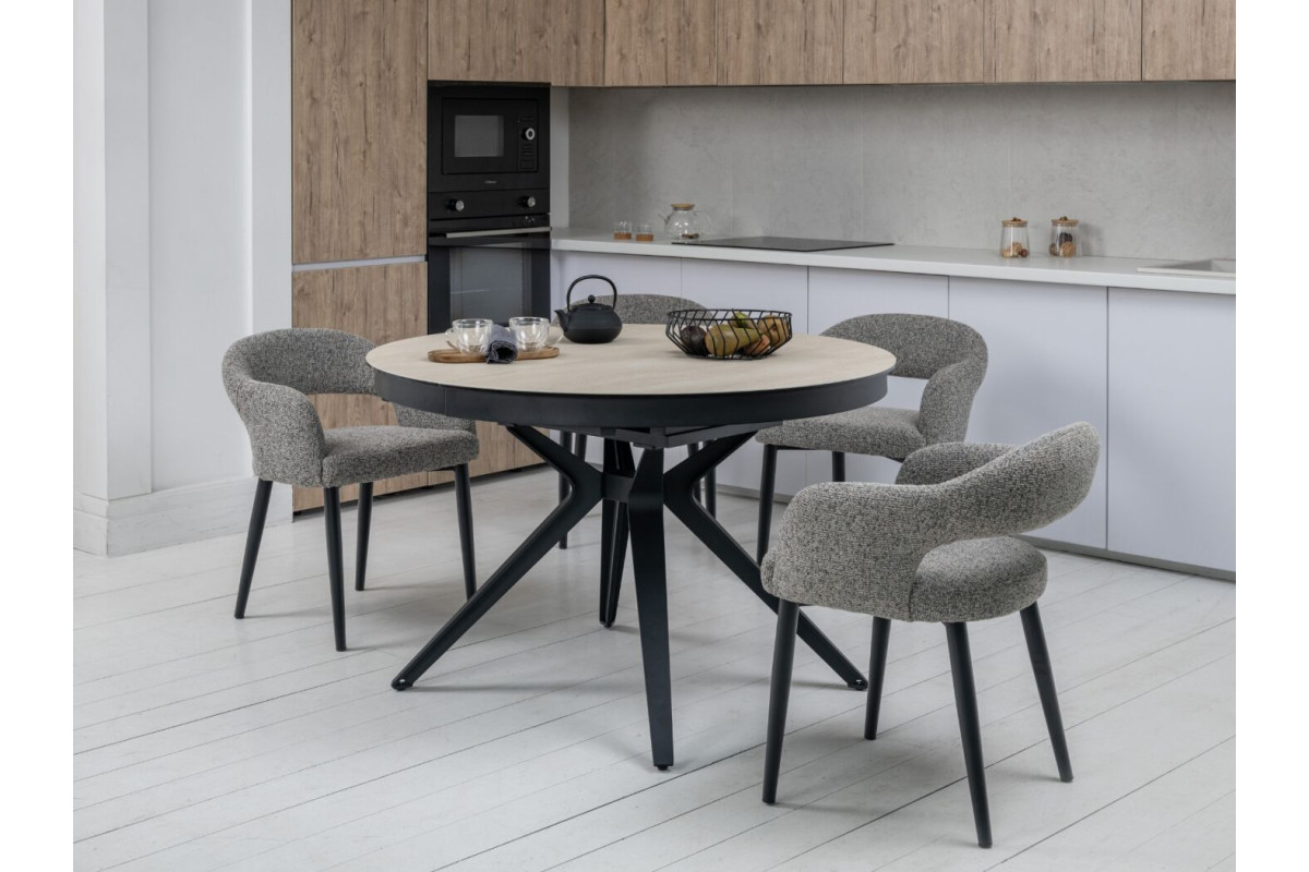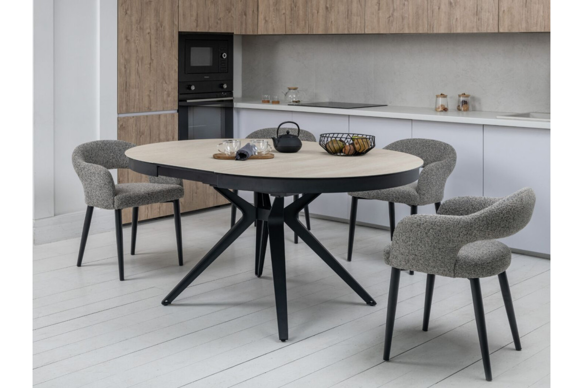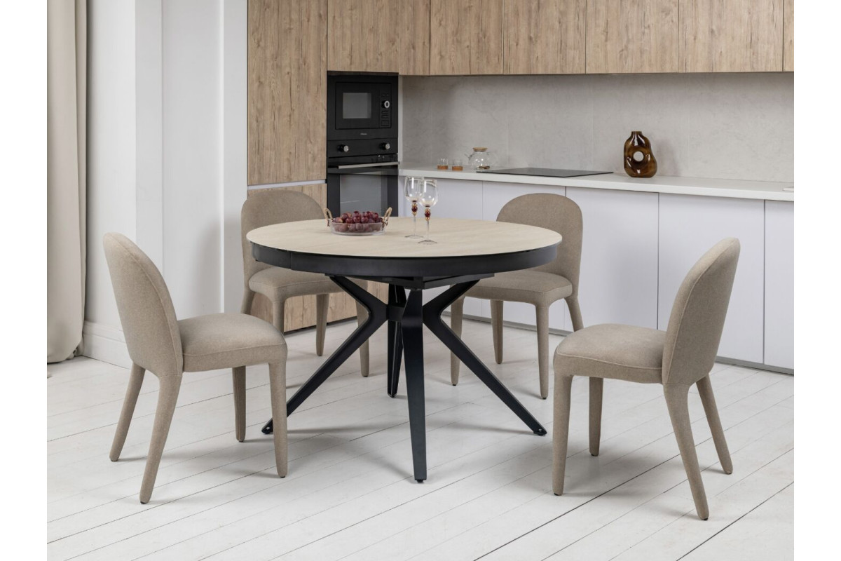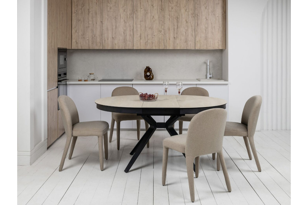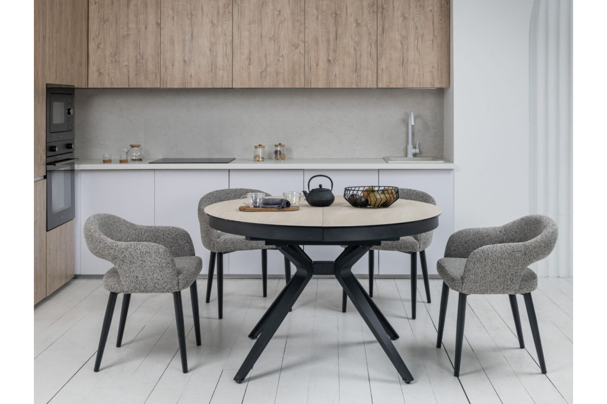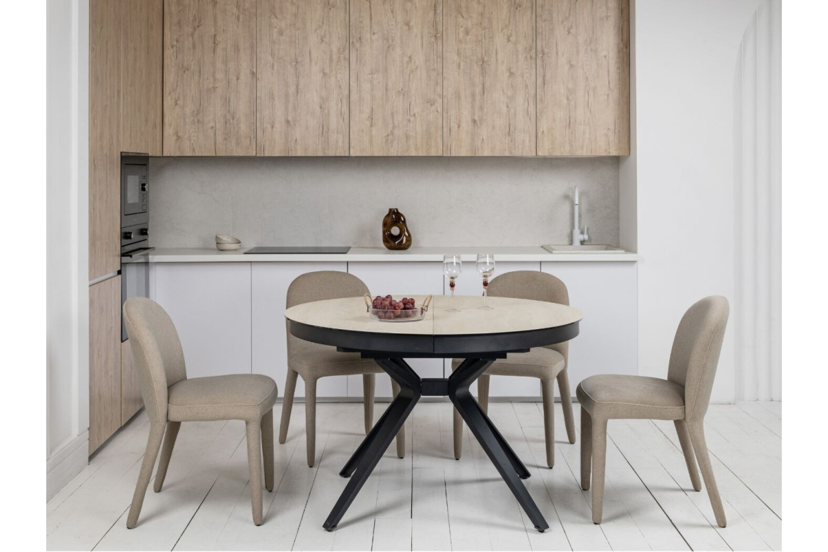 Стільниця виготовлена з матової кераміки та доповнена гартованим склом. Це не лише додає стильного вигляду, але й забезпечує стійкість до подряпин, впливу високих температур та легкість в догляді.Механізм розкладки “книжка-автомат” робить розкладання стола надзвичайно простим і зручним. Завдяки цьому механізму стіл можна легко розкласти з круглої форми діаметром 120 см до максимальної довжини 160 см, що робить його універсальним для різних ситуацій.Завдяки комбінації кольору вествуд та чорного кольору основи стіл має елегантний та сучасний вигляд. Він добре пасуватиме до інтер'єрів у стилі мінімалізм, модерн або індустріальний.Завдяки цим характеристикам, стіл Ноемі TML-996 — чудовий вибір для тих, хто цінує стиль, надійність і функціональність.