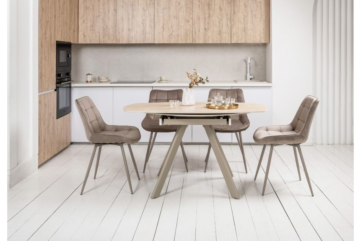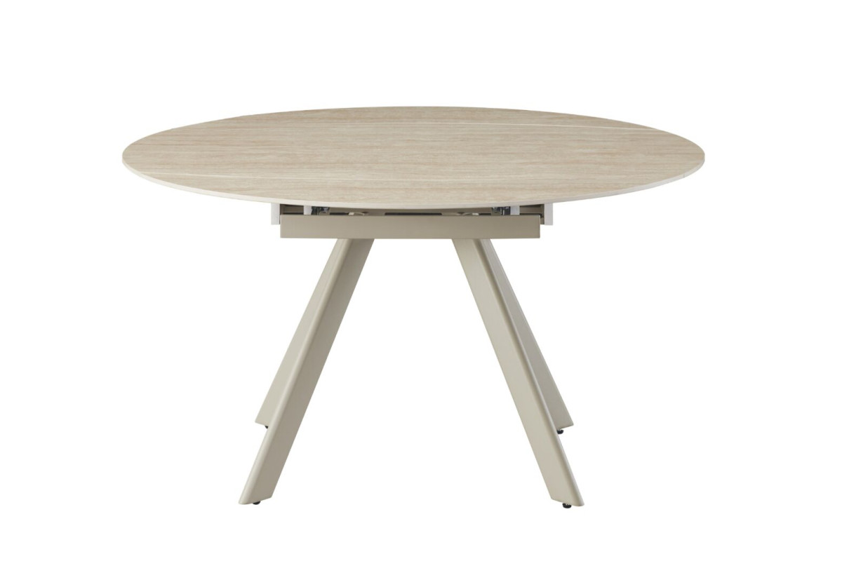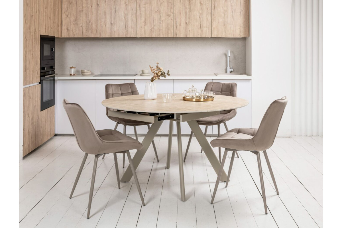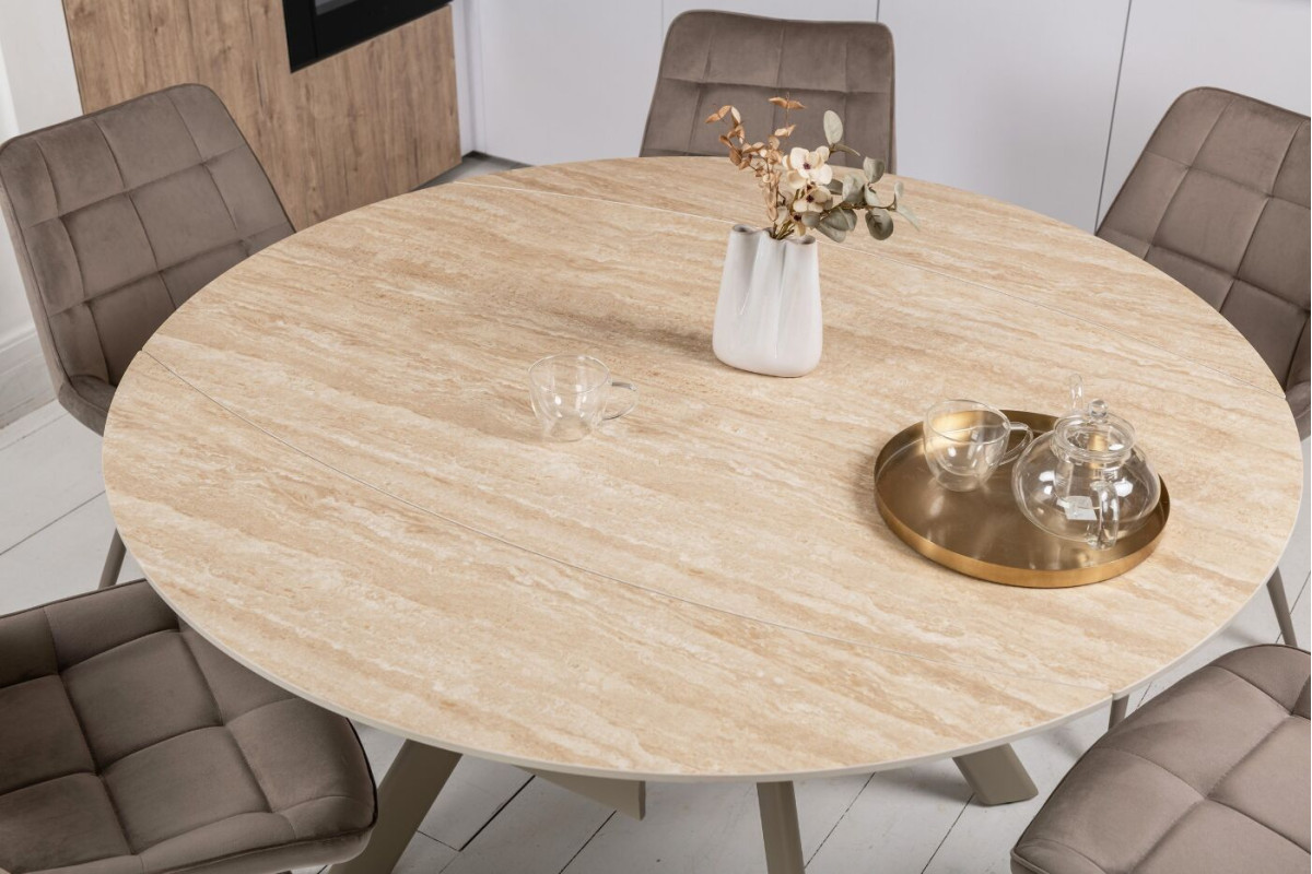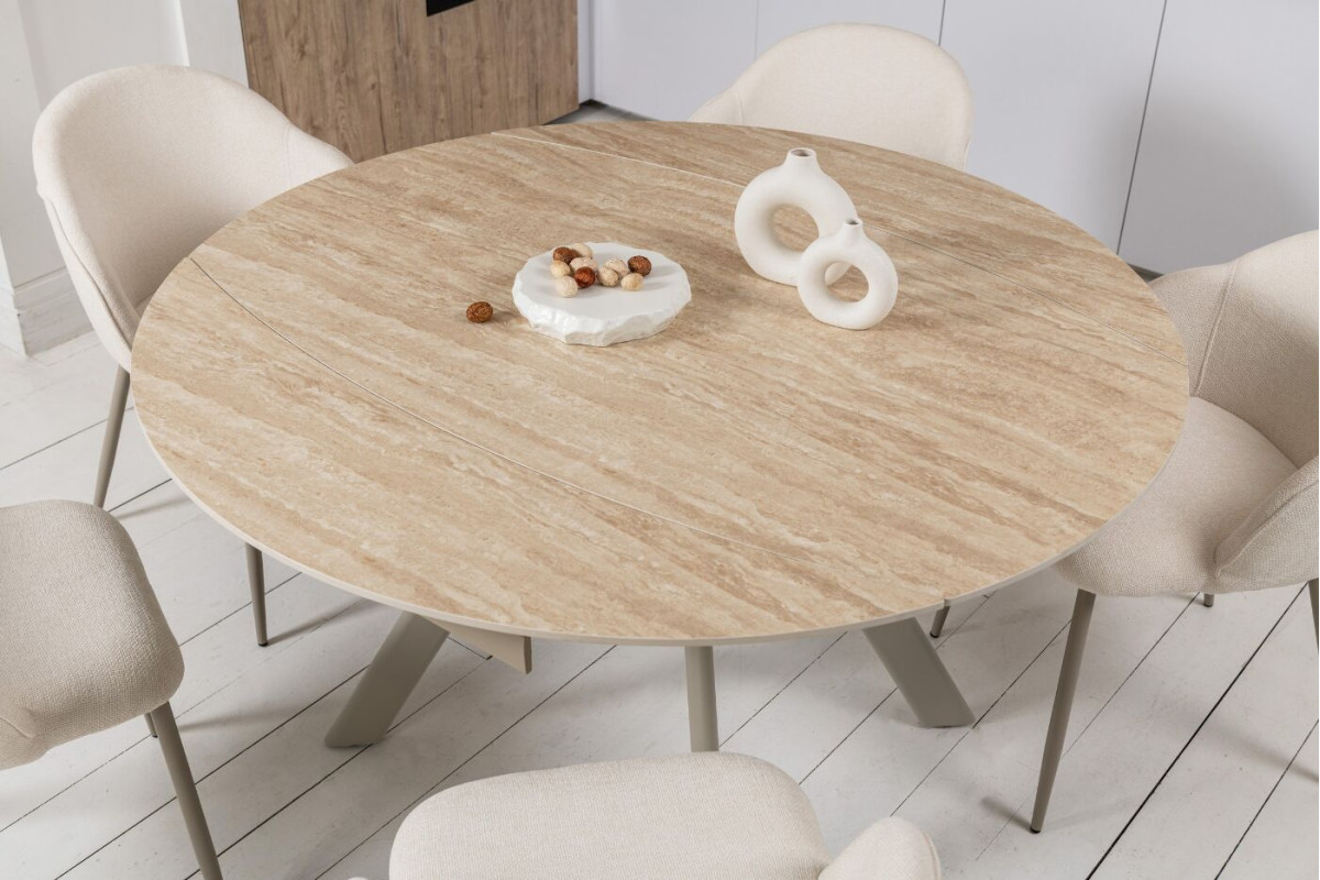 Сучасний керамічний стіл Сієна TML-1240 — це стильне рішення для вашої кухні чи вітальні, яке поєднує витончений дизайн, високу функціональність і міцність. Стільниця з матової кераміки в трендовому відтінку римський травертін додає інтер’єру розкоші та благородства, а фарбована металева основа кольору капучино забезпечує надійність і стійкість конструкції.Стіл має круглу форму діаметром 135 см, що дозволяє комфортно розмістити сім’ю або гостей за обідом. Завдяки боковому механізму розкладки стіл легко трансформується, збільшуючи корисну площу для сервірування або проведення святкових подій. Оптимальна висота 76 см забезпечує зручність для людей будь-якого зросту, а міцні матеріали гарантують тривалий термін експлуатації навіть при щоденному використанні.Ідеальний вибір для тих, хто цінує сучасний стиль, практичність і комфорт у кожній деталі. Стіл Сієна — це не просто меблі, а справжній акцент вашого інтер’єру, що підкреслює вашу любов до вишуканого дизайну та якісних рішень.
