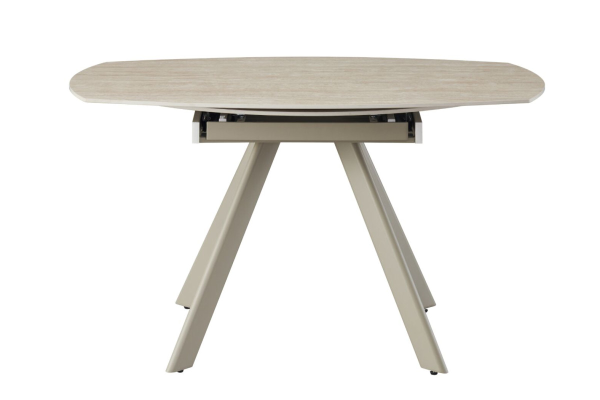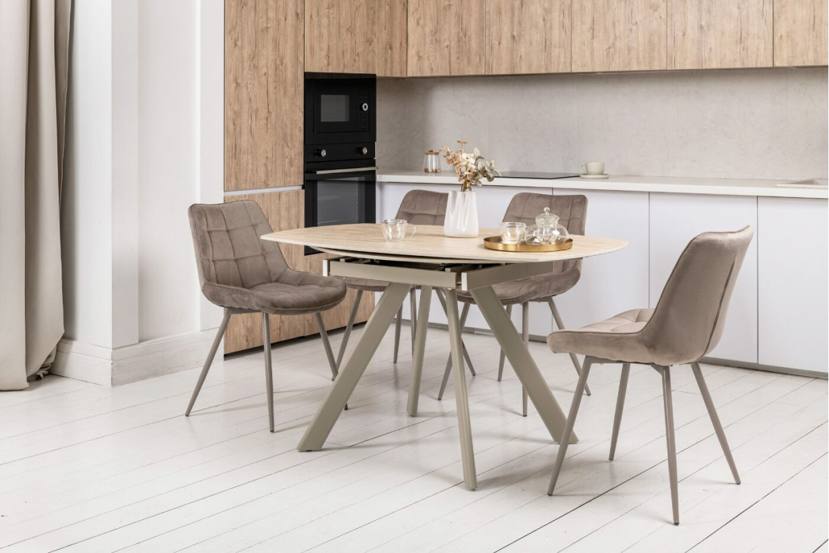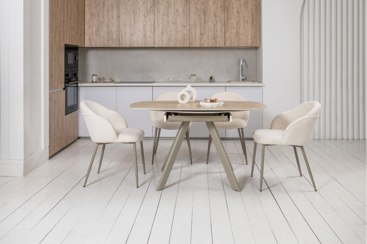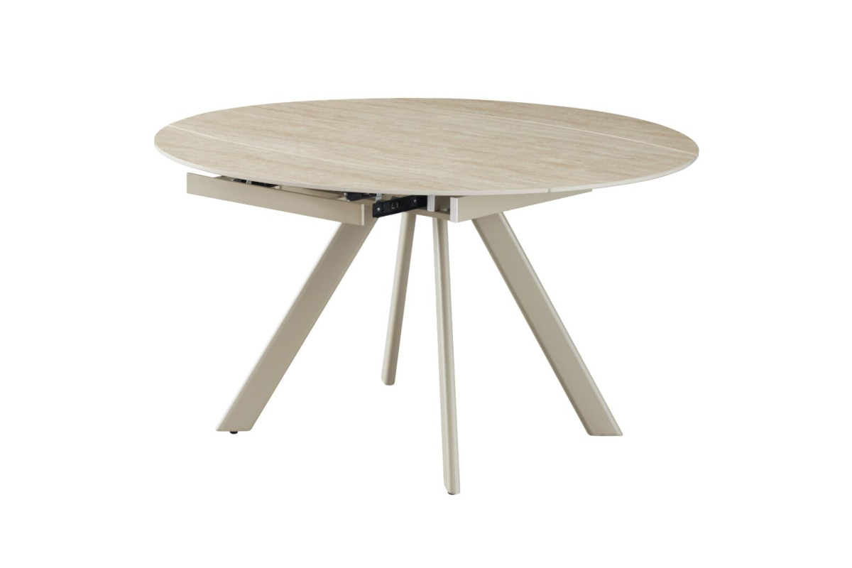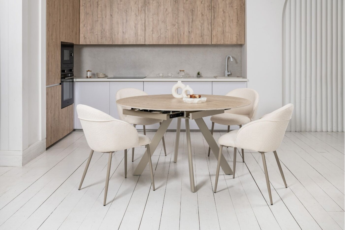 Сучасний керамічний стіл Сієна TML-1240 — це стильне рішення для вашої кухні чи вітальні, яке поєднує витончений дизайн, високу функціональність і міцність. Стільниця з матової кераміки в трендовому відтінку римський травертін додає інтер’єру розкоші та благородства, а фарбована металева основа кольору капучино забезпечує надійність і стійкість конструкції.Стіл має круглу форму діаметром 135 см, що дозволяє комфортно розмістити сім’ю або гостей за обідом. Завдяки боковому механізму розкладки стіл легко трансформується, збільшуючи корисну площу для сервірування або проведення святкових подій. Оптимальна висота 76 см забезпечує зручність для людей будь-якого зросту, а міцні матеріали гарантують тривалий термін експлуатації навіть при щоденному використанні.Ідеальний вибір для тих, хто цінує сучасний стиль, практичність і комфорт у кожній деталі. Стіл Сієна — це не просто меблі, а справжній акцент вашого інтер’єру, що підкреслює вашу любов до вишуканого дизайну та якісних рішень.