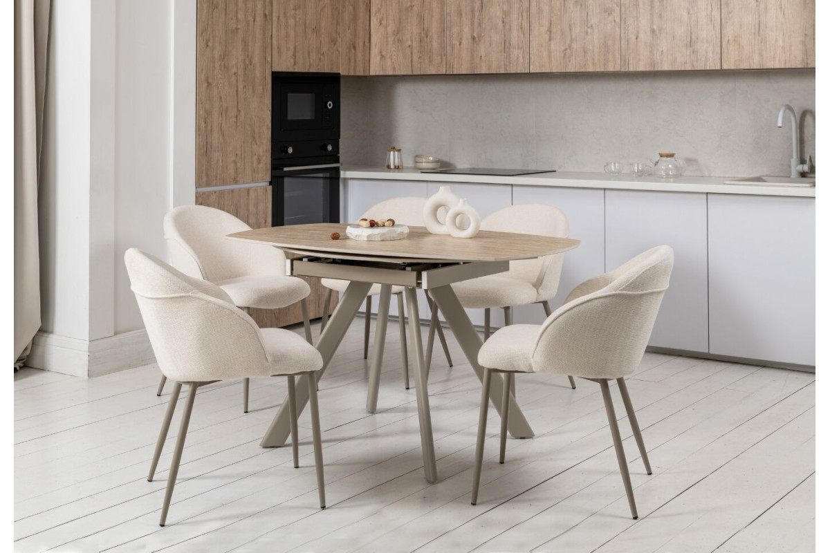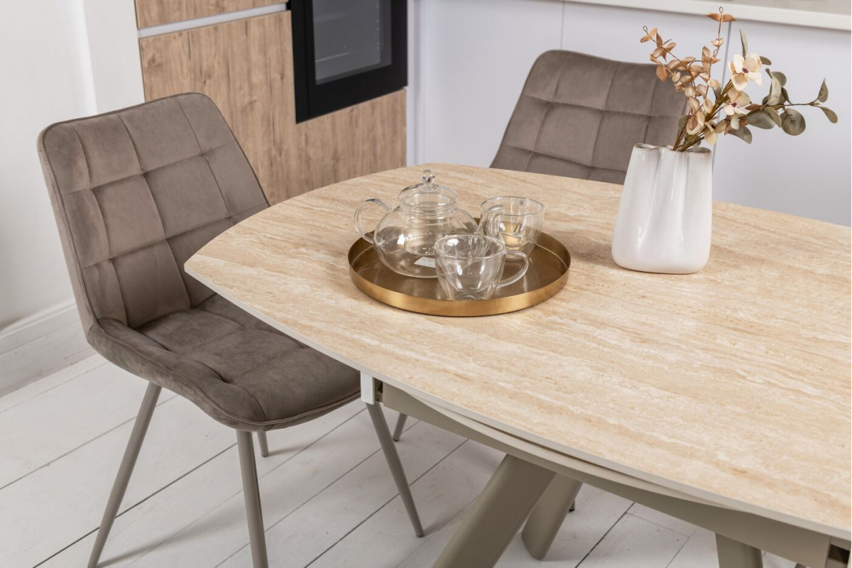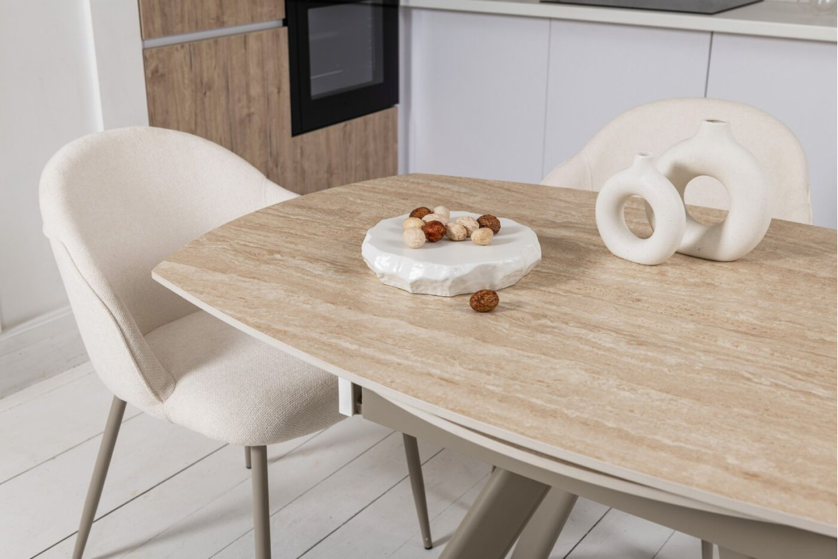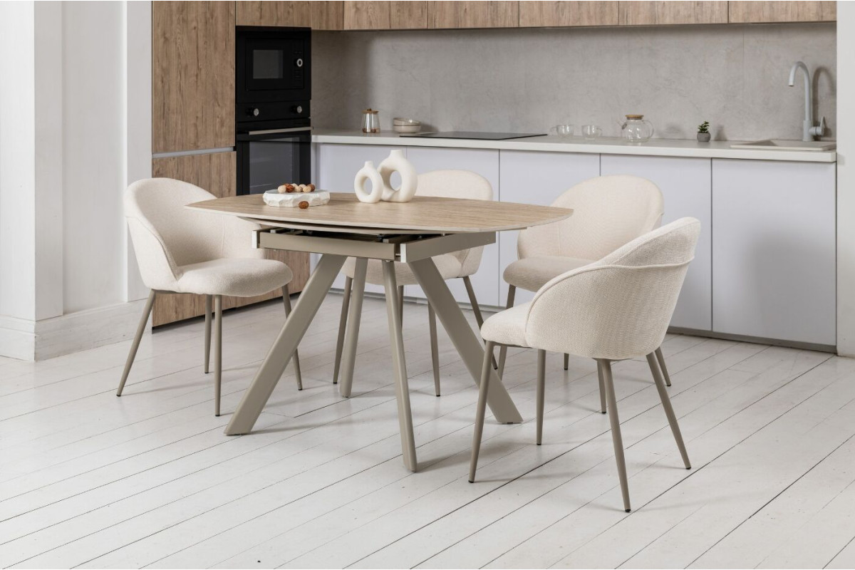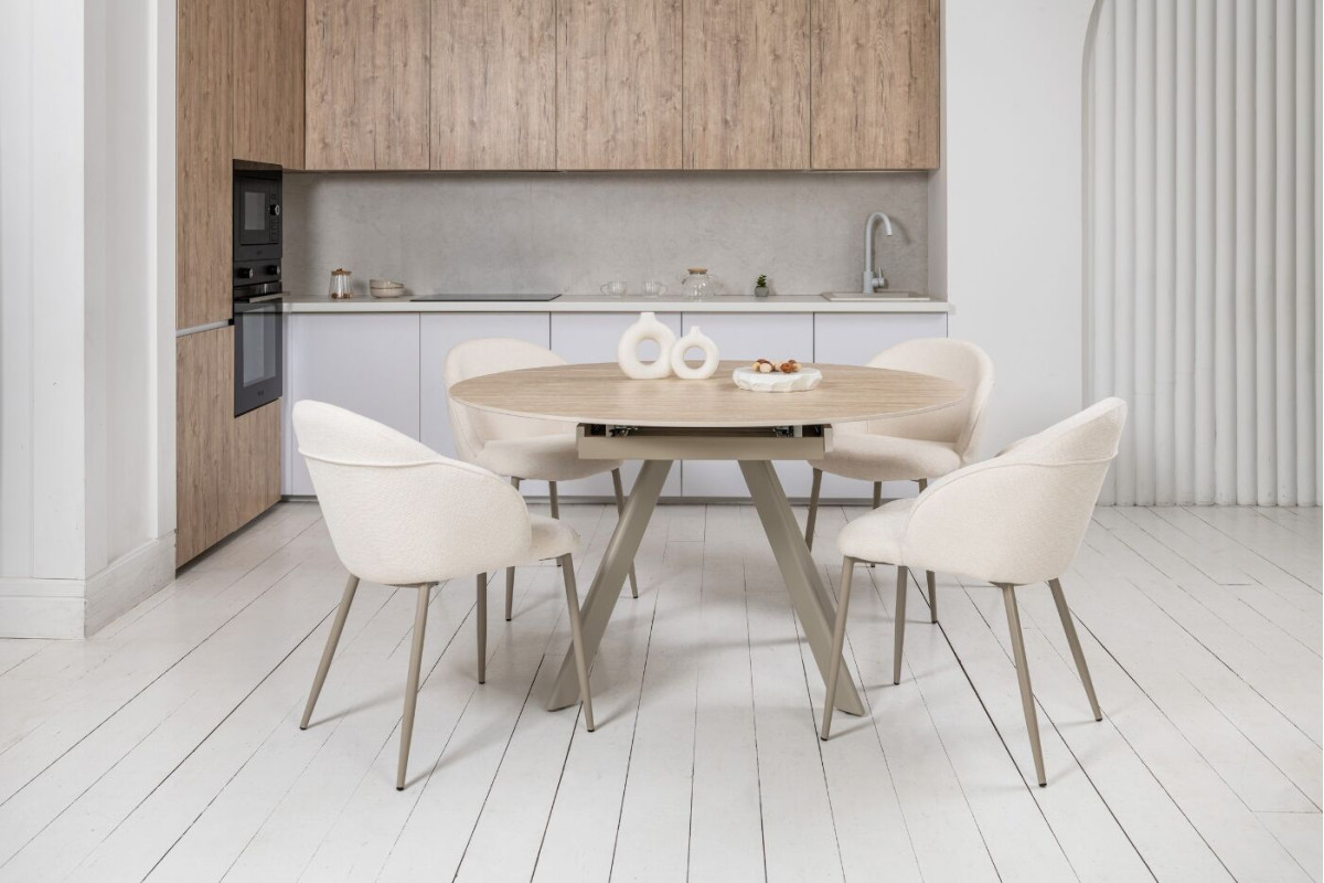 Сучасний керамічний стіл Сієна TML-1240 — це стильне рішення для вашої кухні чи вітальні, яке поєднує витончений дизайн, високу функціональність і міцність. Стільниця з матової кераміки в трендовому відтінку римський травертін додає інтер’єру розкоші та благородства, а фарбована металева основа кольору капучино забезпечує надійність і стійкість конструкції.Стіл має круглу форму діаметром 135 см, що дозволяє комфортно розмістити сім’ю або гостей за обідом. Завдяки боковому механізму розкладки стіл легко трансформується, збільшуючи корисну площу для сервірування або проведення святкових подій. Оптимальна висота 76 см забезпечує зручність для людей будь-якого зросту, а міцні матеріали гарантують тривалий термін експлуатації навіть при щоденному використанні.Ідеальний вибір для тих, хто цінує сучасний стиль, практичність і комфорт у кожній деталі. Стіл Сієна — це не просто меблі, а справжній акцент вашого інтер’єру, що підкреслює вашу любов до вишуканого дизайну та якісних рішень.