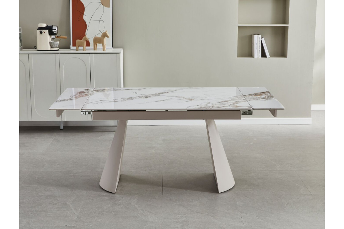 Керамічний стіл Сорренто TML-1301 голден вайт + капучино створений для інтер’єрів, у яких цінують гармонію та витончені деталі. Його глянцева стільниця у благородному відтінку голден вайт нагадує світлий мармур, що м’яко вловлює відблиски світла й наповнює простір відчуттям тепла та легкості. Поверхня гладка та приємна на дотик — вона не лише прикрашає кімнату, а й чудово витримує щоденний ритм сімейного життя.Металева основа у кольорі капучино додає конструкції солідності, але не перевантажує її — навпаки, створює елегантний баланс між масивністю та повітряністю. Завдяки продуманому боковому механізму стіл легко трансформується, збільшуючись із 130 до 180 см. Цей рух — плавний і надійний, наче добре відпрацьований жест, — дозволяє за лічені секунди підготувати простір до зустрічі гостей.Сорренто TML-1301 підкреслює сучасний стиль інтер’єру, але водночас залишається нейтральним, універсальним елементом, який легко поєднується з різними кольорами, матеріалами та декором. Це стіл, який робить простір цілісним і завершеним, додає йому характеру та створює атмосферу затишку, де хочеться збиратися разом знову і знову.
