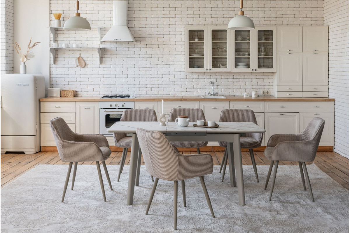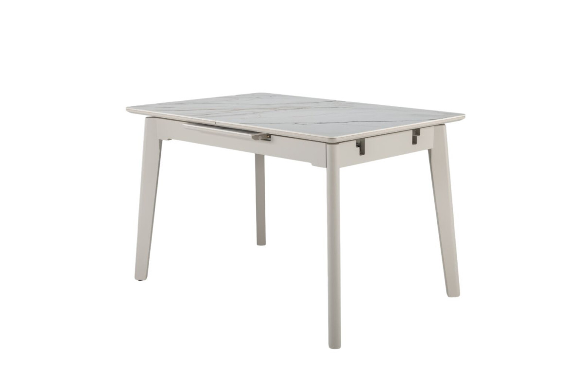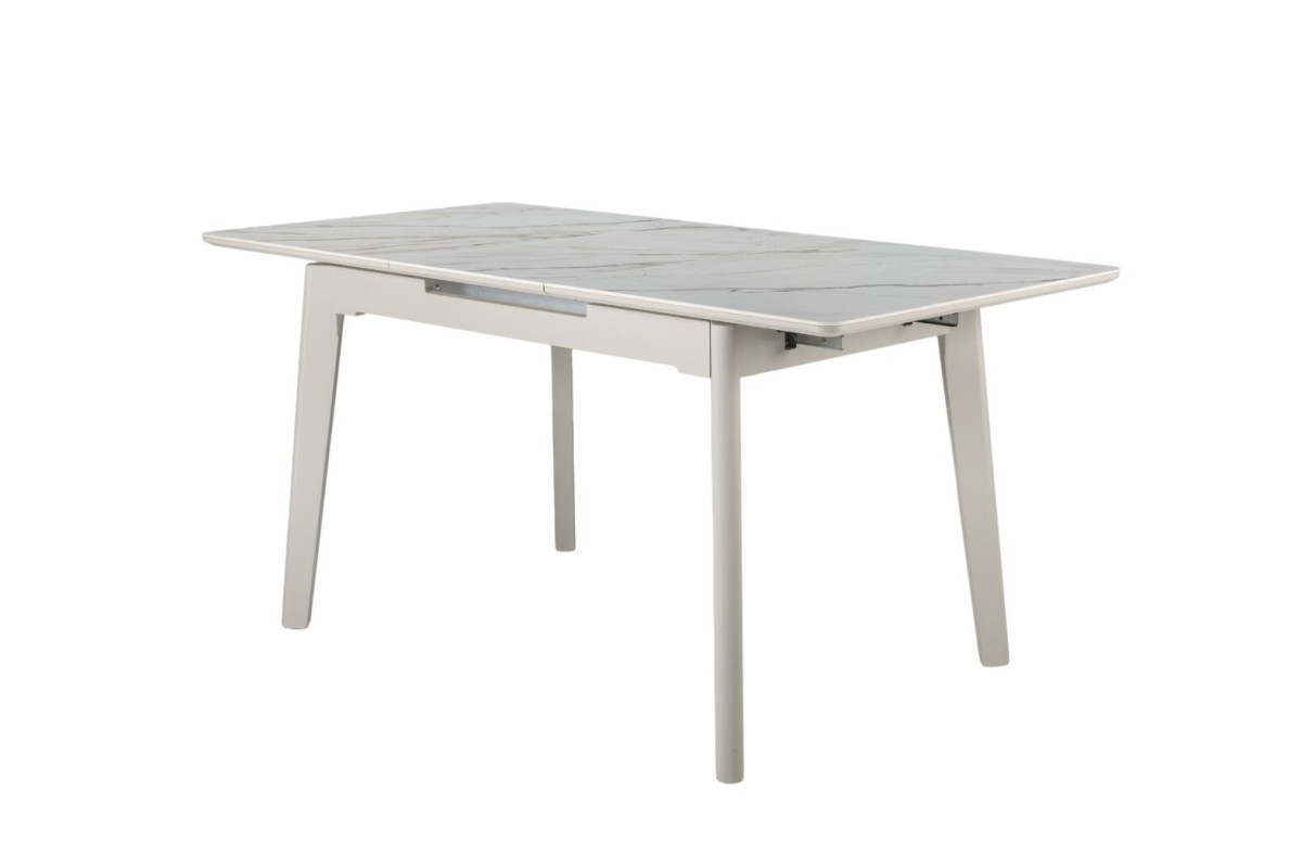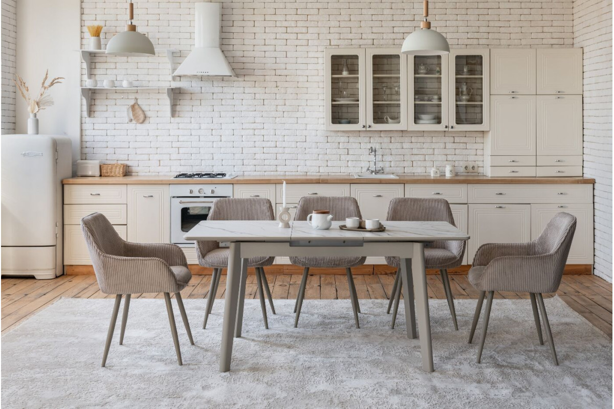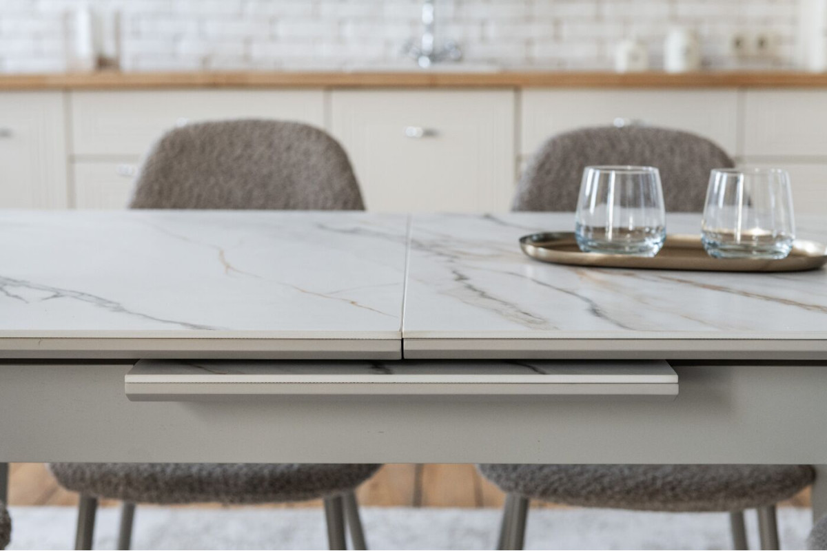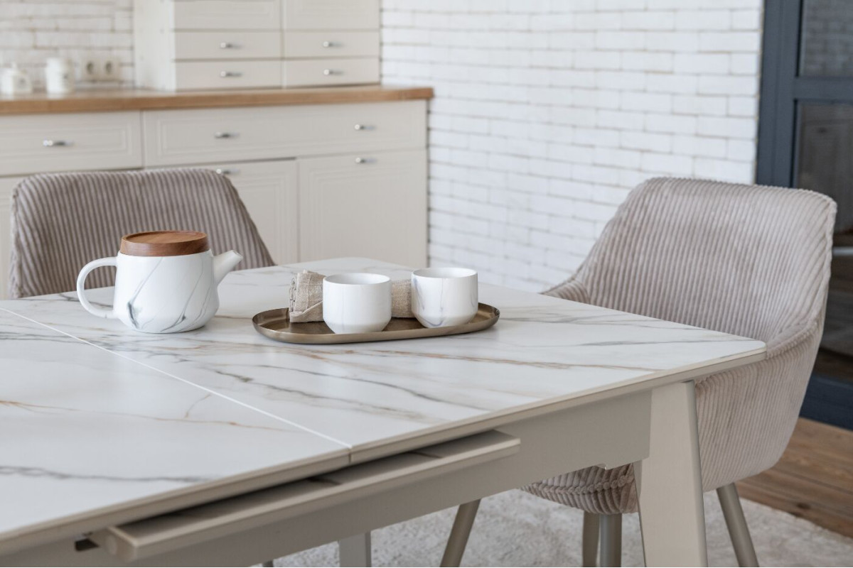 TM-76 — сучасний розкладний стіл, який поєднує витонченість природних відтінків та надійність перевірених матеріалів. Відтінок голден сенд із теплим пісочним акцентом надає інтер’єру затишку та вишуканої теплоти. Ідеальний вибір для їдальні чи кухні у натуральних, скандинавських або середземноморських тонах.Стільниця виконана з матової кераміки у комбінації з матовим МДФ — практичне й стильне рішення, стійке до подряпин та високих температур. Основа з пофарбованого дерева забезпечує надійність та стабільність конструкції.Стіл має автоматичний розкладний механізм, що дозволяє збільшити довжину зі 120 до 160 см — ідеально для прийому гостей або родинних вечерь.