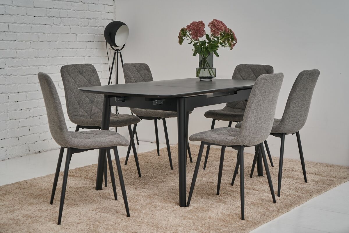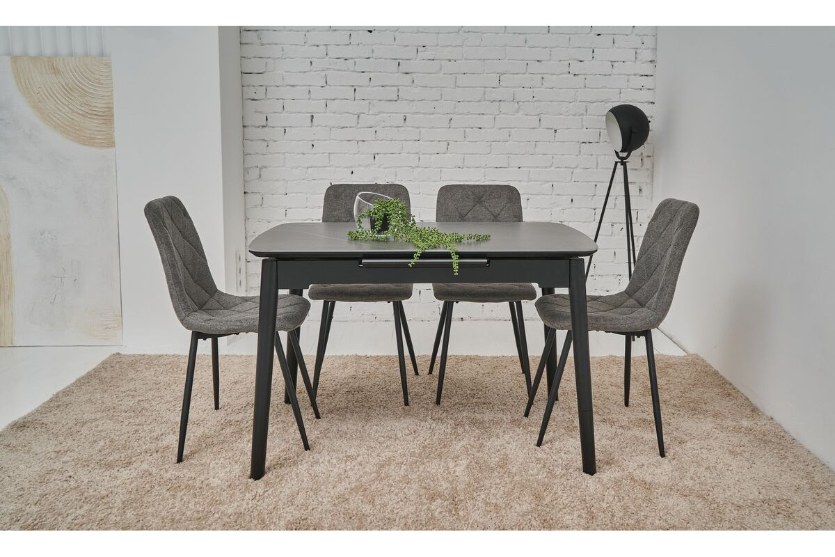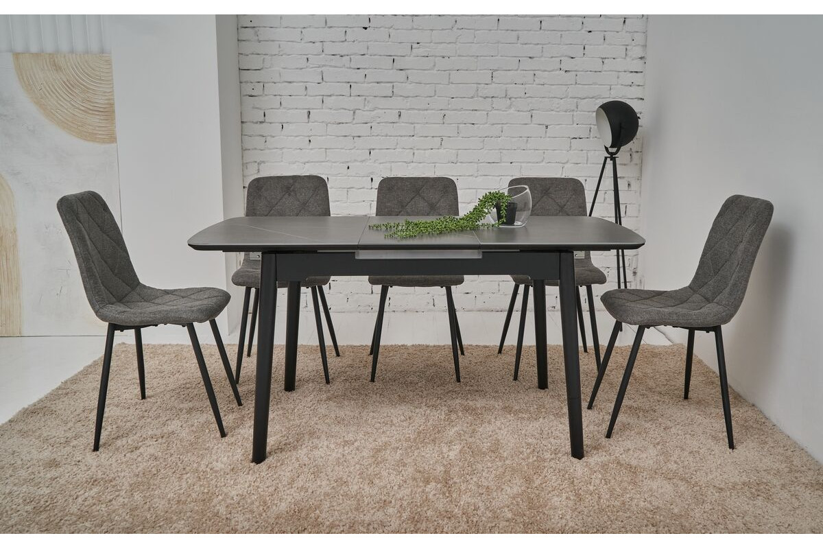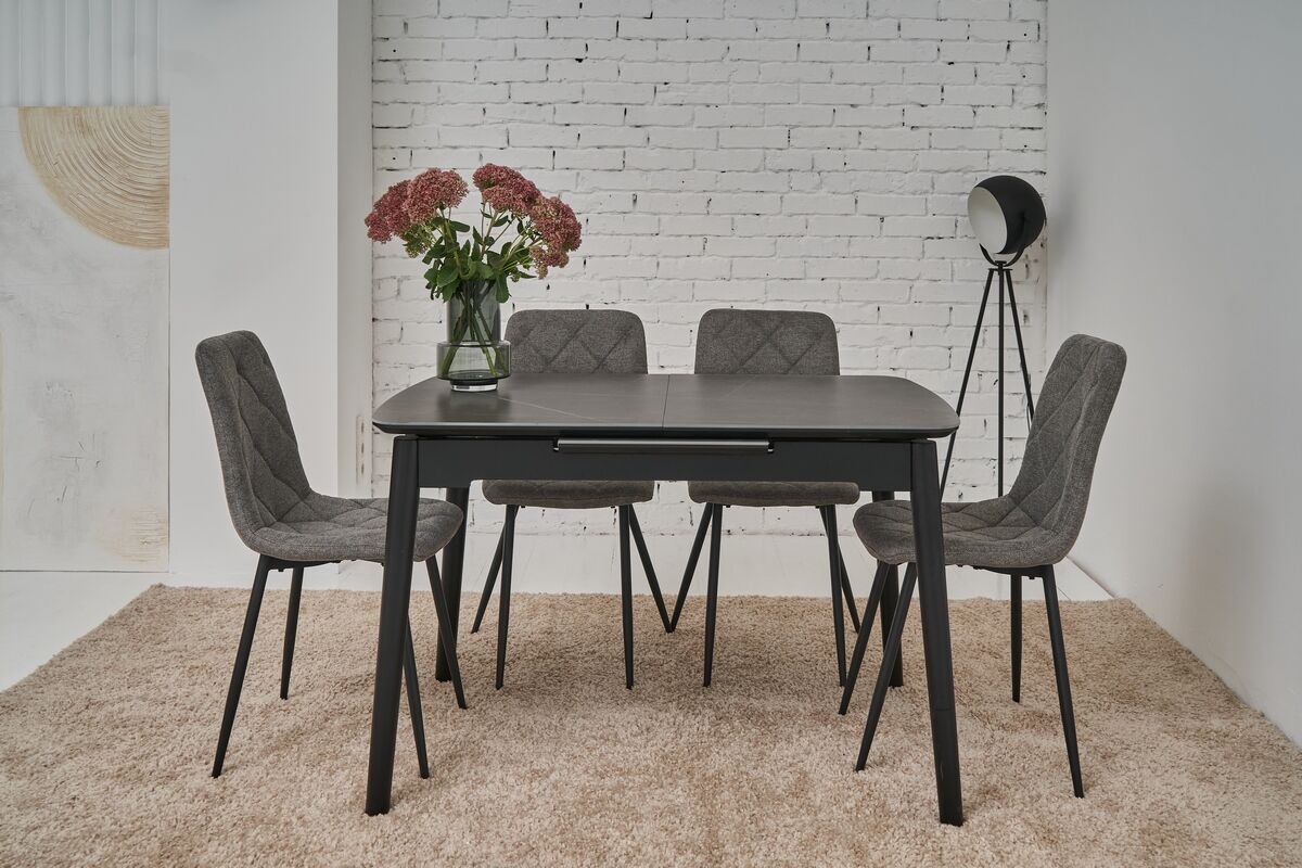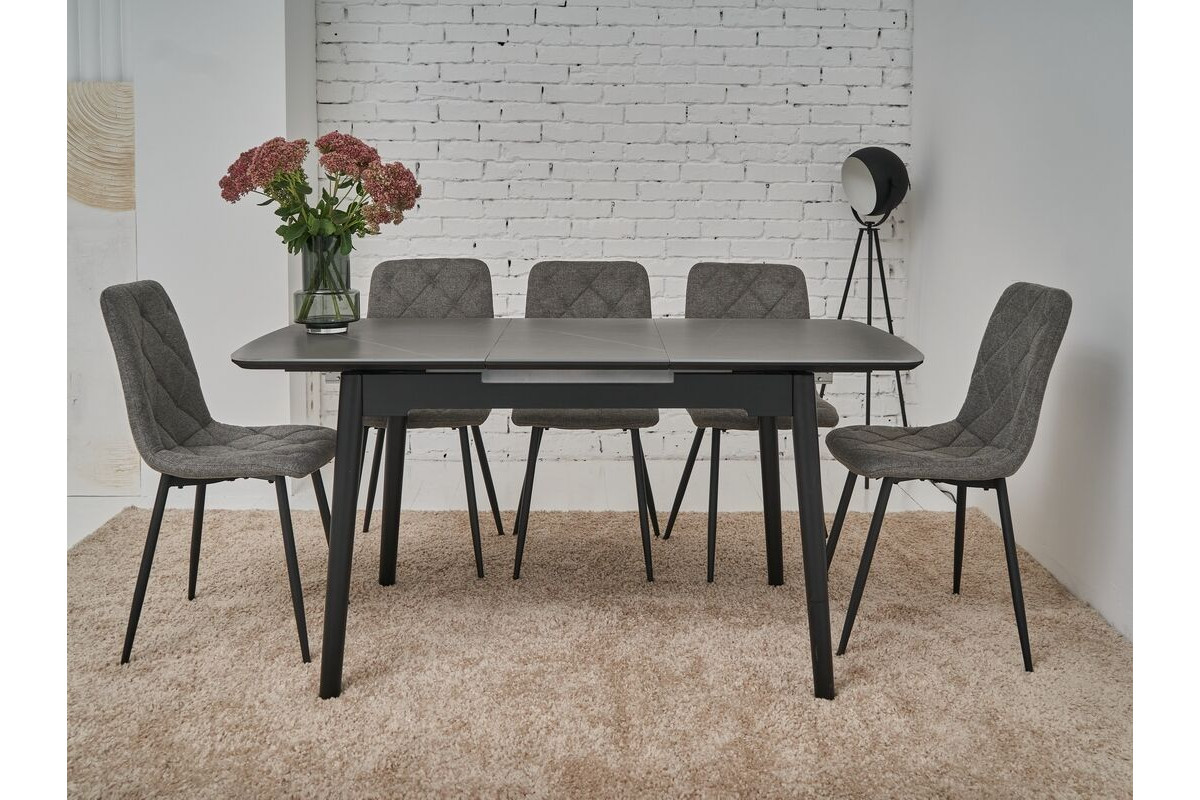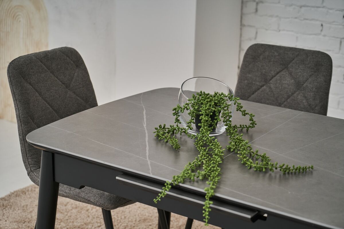 Наш прямокутний обідній стіл прикрасить вашу їдальню завдяки своєму сучасному дизайну і неймовірному кольору петра грей. Цей стіл не лише вражає естетикою, але й має високу функціональність завдяки автоматичному механізму розкладання. Легко змінюйте його розміри від 120 см до максимальних 160 см, створюючи ідеальний простір як для сімейних обідів, так і для вечірок з друзями.Столешня з матової кераміки та матового МДФ не лише забезпечує стильний зовнішній вигляд, але й довговічність. Матеріали високої якості гарантують стійкість до пошкоджень, дозволяючи насолоджуватися красою столу протягом багатьох років. Фарбована дерев'яна основа забезпечує надійну підтримку, роблячи стіл стійким і міцним.