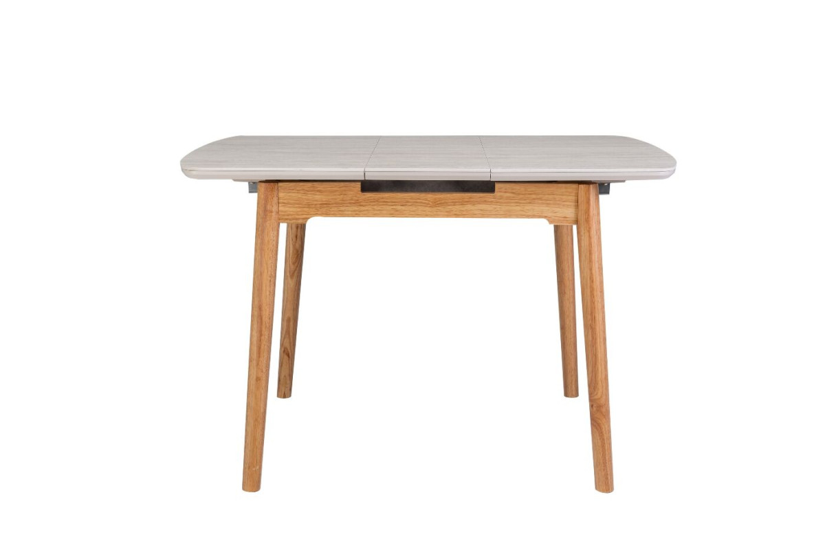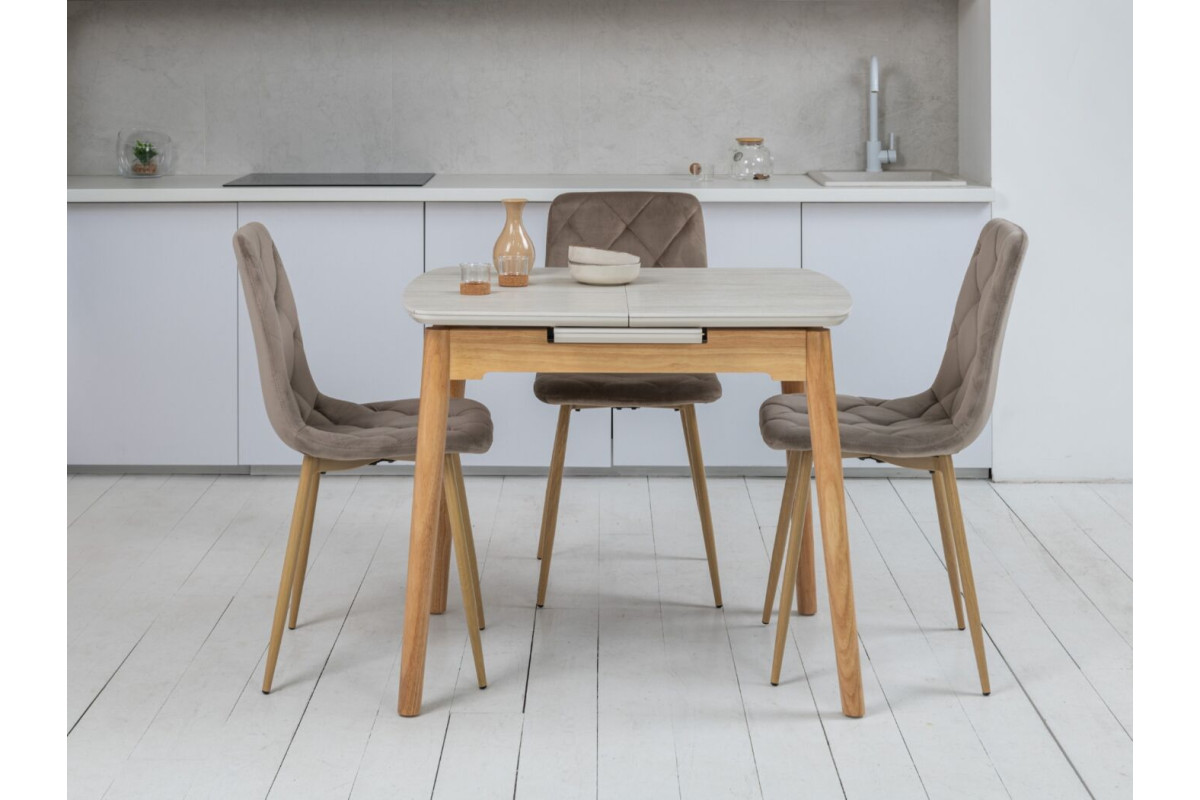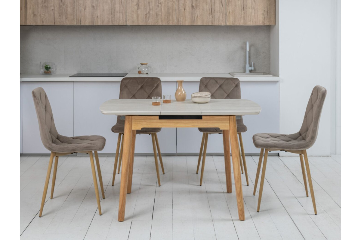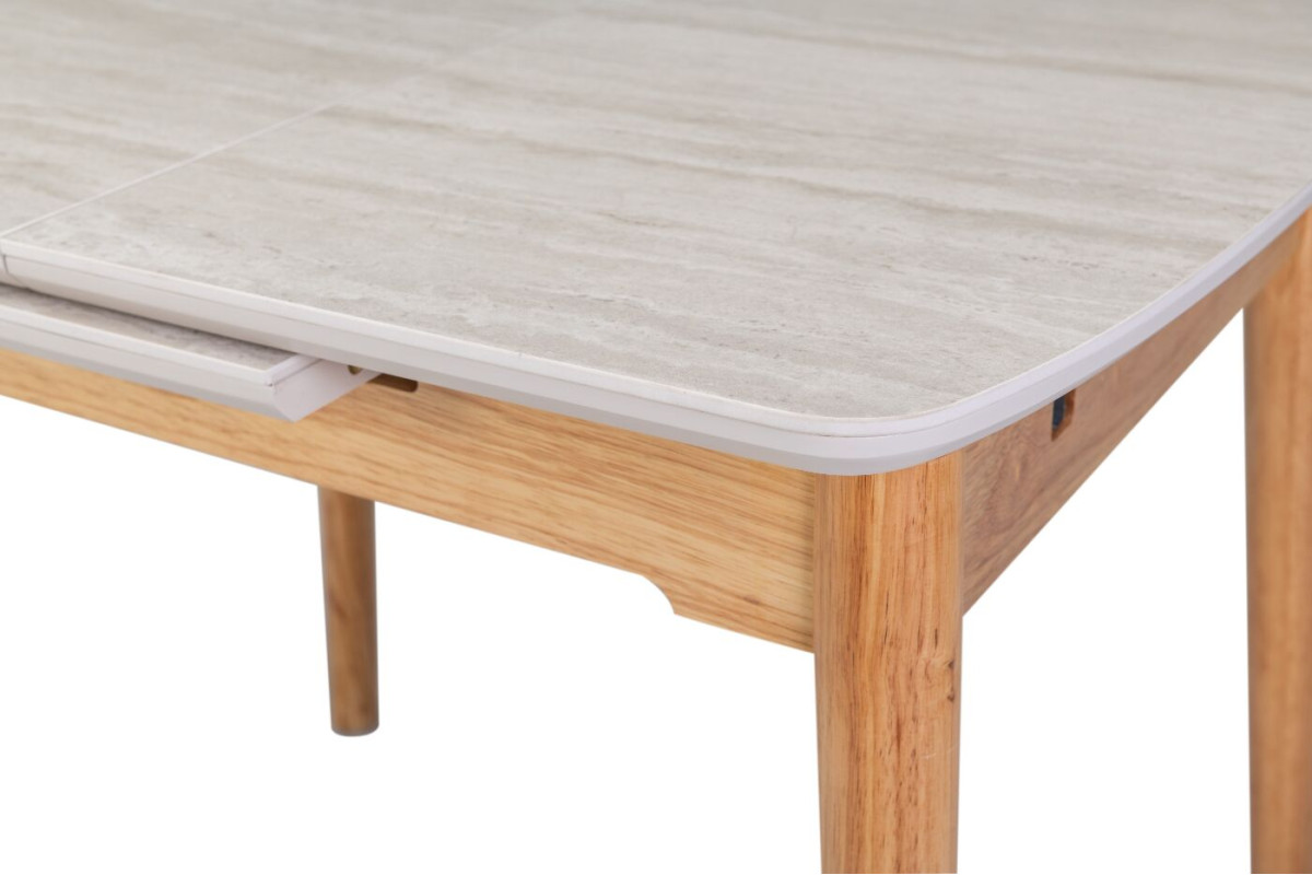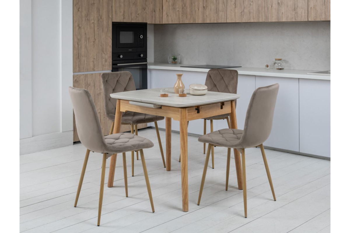 Стільниця виконана з матової кераміки кольору травертин, яка нагадує натуральний камінь з його характерними текстурами і м'якими відтінками. Матова поверхня надає столу витончений вигляд і запобігає появі відблисків, що робить його чудовим вибором для створення затишної атмосфери.Основа столу виготовлена з натурального дуба, що додає йому тепла та природного шарму. Дерев'яна основа не тільки підвищує візуальну привабливість столу, але й забезпечує надійність і довговічність конструкції.Компактний розмір (90 см у довжину) дозволяє столу легко вписуватися в невеликі простори, такі як кухні або маленькі обідні зони. Однак завдяки розкладному механізму стіл може збільшуватися до 120 см, надаючи додатковий простір для прийому гостей або сімейних обідів. Цей функціональний дизайн робить стіл TM-87-1 зручним і практичним вибором для щоденного використання.