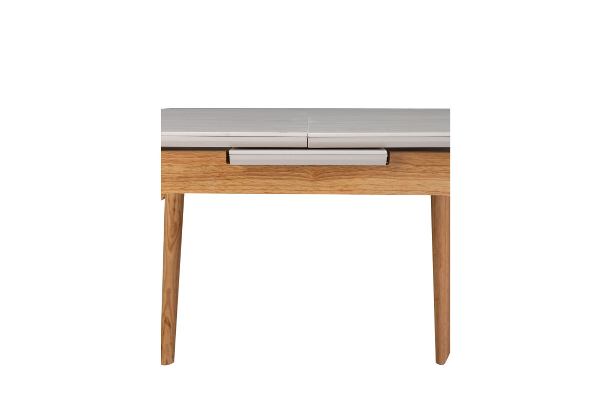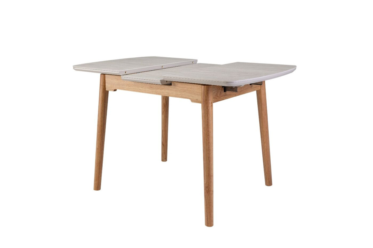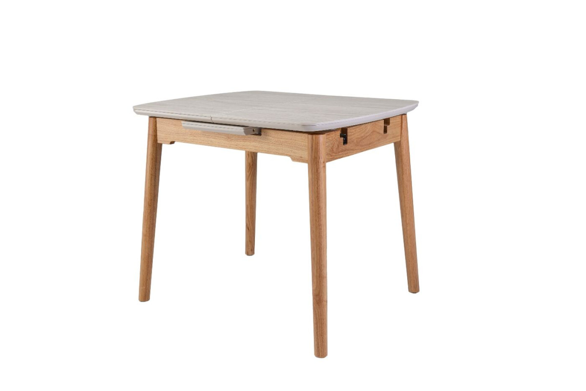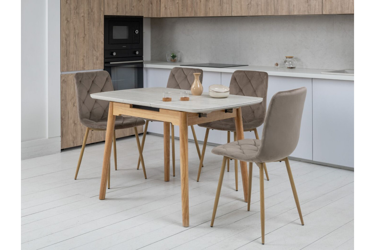 Стільниця виконана з матової кераміки кольору травертин, яка нагадує натуральний камінь з його характерними текстурами і м'якими відтінками. Матова поверхня надає столу витончений вигляд і запобігає появі відблисків, що робить його чудовим вибором для створення затишної атмосфери.Основа столу виготовлена з натурального дуба, що додає йому тепла та природного шарму. Дерев'яна основа не тільки підвищує візуальну привабливість столу, але й забезпечує надійність і довговічність конструкції.Компактний розмір (90 см у довжину) дозволяє столу легко вписуватися в невеликі простори, такі як кухні або маленькі обідні зони. Однак завдяки розкладному механізму стіл може збільшуватися до 120 см, надаючи додатковий простір для прийому гостей або сімейних обідів. Цей функціональний дизайн робить стіл TM-87-1 зручним і практичним вибором для щоденного використання.