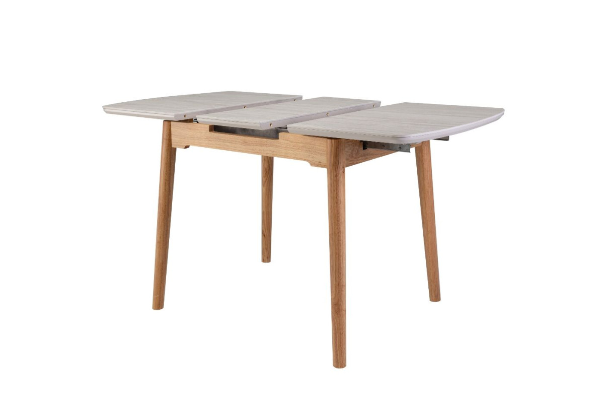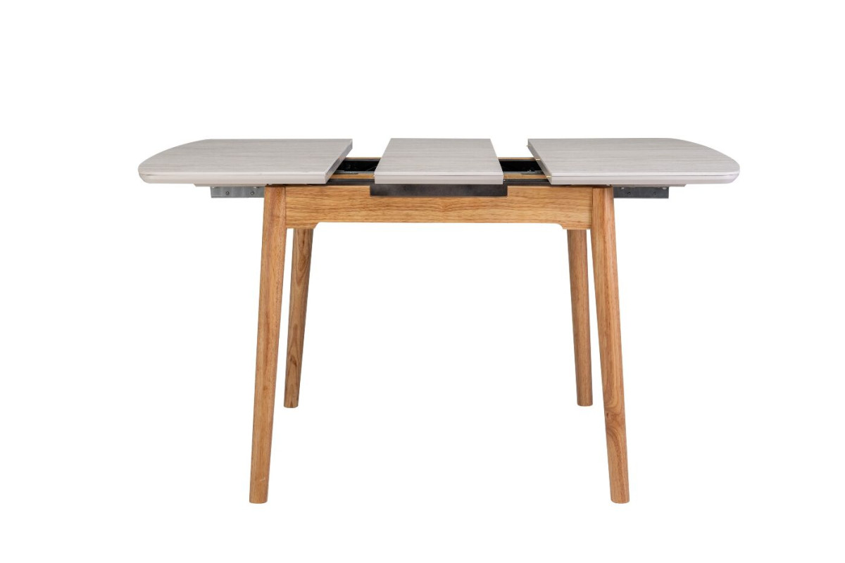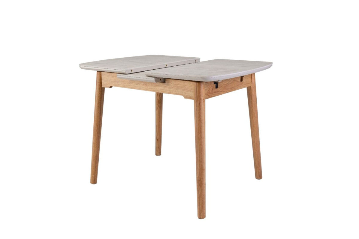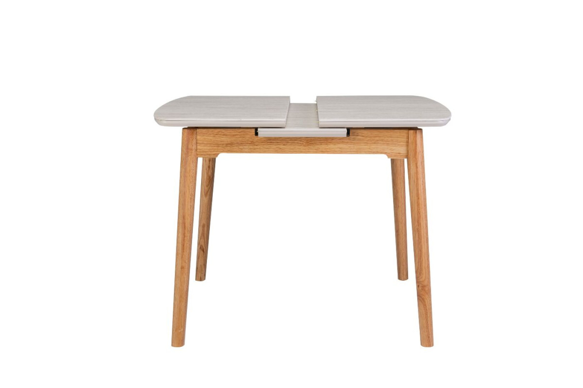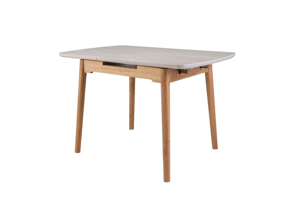 Стільниця виконана з матової кераміки кольору травертин, яка нагадує натуральний камінь з його характерними текстурами і м'якими відтінками. Матова поверхня надає столу витончений вигляд і запобігає появі відблисків, що робить його чудовим вибором для створення затишної атмосфери.Основа столу виготовлена з натурального дуба, що додає йому тепла та природного шарму. Дерев'яна основа не тільки підвищує візуальну привабливість столу, але й забезпечує надійність і довговічність конструкції.Компактний розмір (90 см у довжину) дозволяє столу легко вписуватися в невеликі простори, такі як кухні або маленькі обідні зони. Однак завдяки розкладному механізму стіл може збільшуватися до 120 см, надаючи додатковий простір для прийому гостей або сімейних обідів. Цей функціональний дизайн робить стіл TM-87-1 зручним і практичним вибором для щоденного використання.