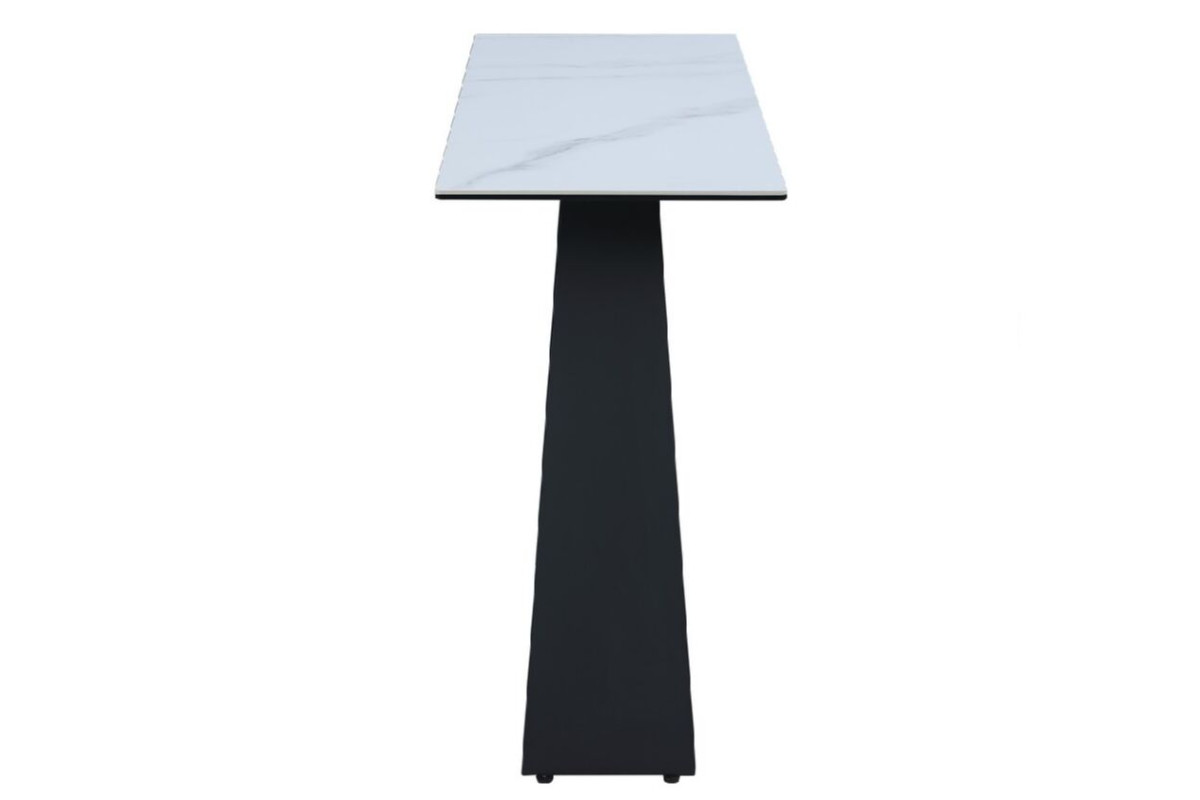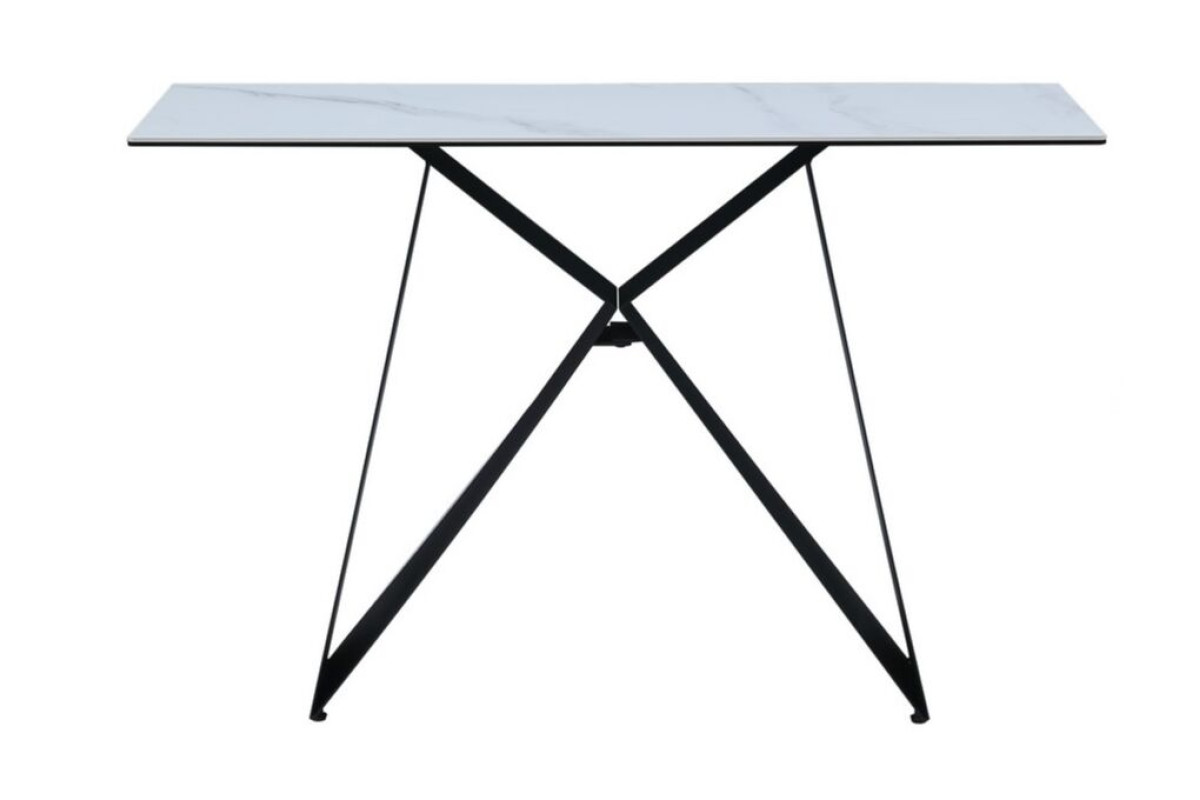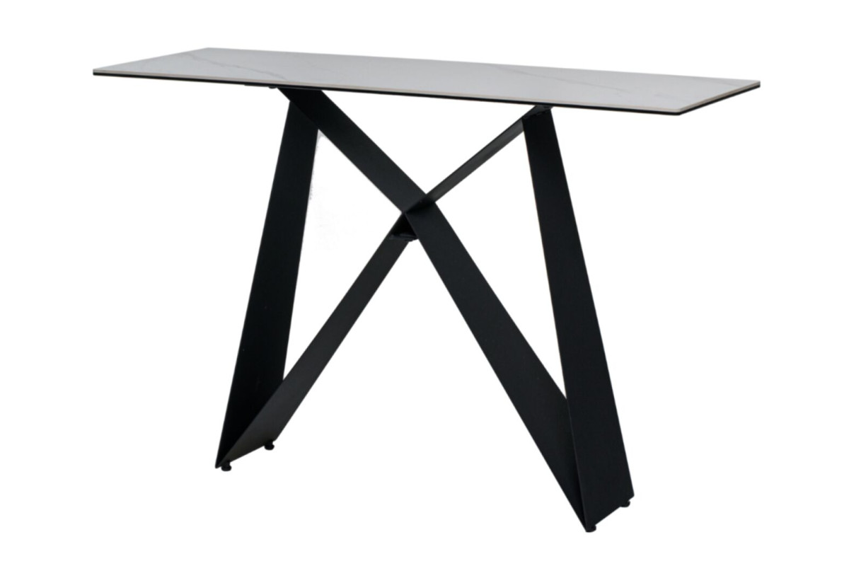 Матова керамічна стільниця в кольорі білий мармур створює атмосферу розкоші та вишуканості. Її гладка текстура і природний малюнок додають простору витонченості та елегантності.Основу консольного столика виконано з фарбованого металу чорного кольору, що додає конструкції стабільності та сучасного вигляду. Такий контраст із білим мармуром робить стіл справжнім акцентом будь-якого інтер’єру.Завдяки використанню гартованого скла та кераміки, стільниця є не лише естетично привабливою, а й стійкою до пошкоджень і подряпин.Консоль не тільки додає естетики, але й додає простору функціональність, тому вона є важливим елементом у багатьох сучасних інтер’єрах.