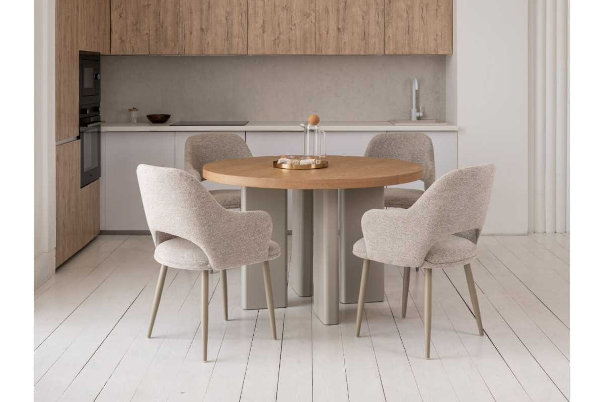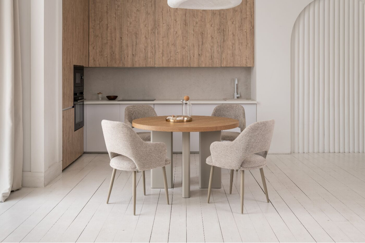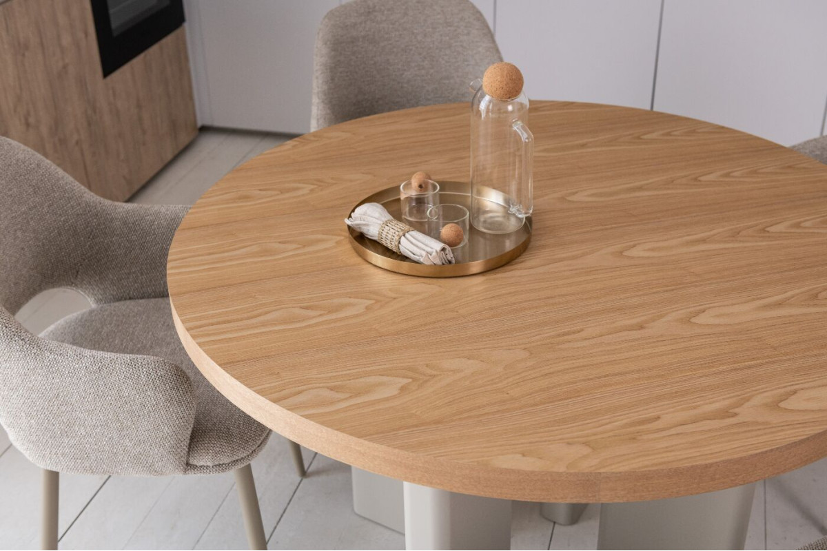 Стіл шпонований МДФ Амбра TM-235 ясень + теплий пісок — елегантне рішення для сучасної їдальні або кухні.Кругла стільниця діаметром 120 см виготовлена зі шпонованого МДФ у відтінку “ясень”, що додає виробу природного шар... Читать далее...